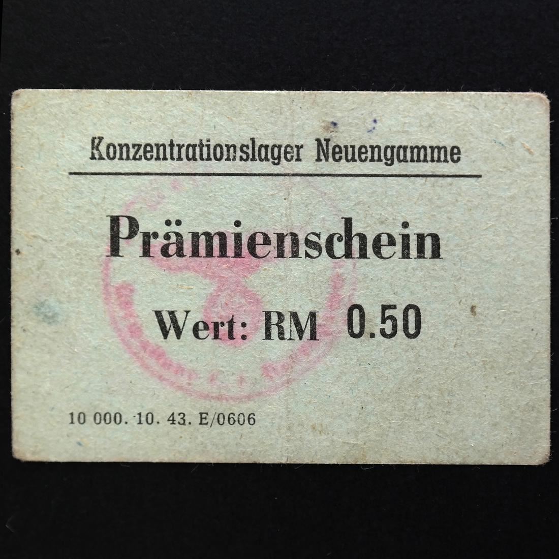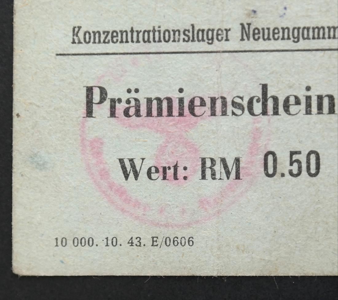 Konzentrationslager Neuengamme / Prmienschein / Wert: RM 0.50 on grayish blue card, magenta control handstamp, measures approx 70 by 49mm, light vertical fold, VF.
