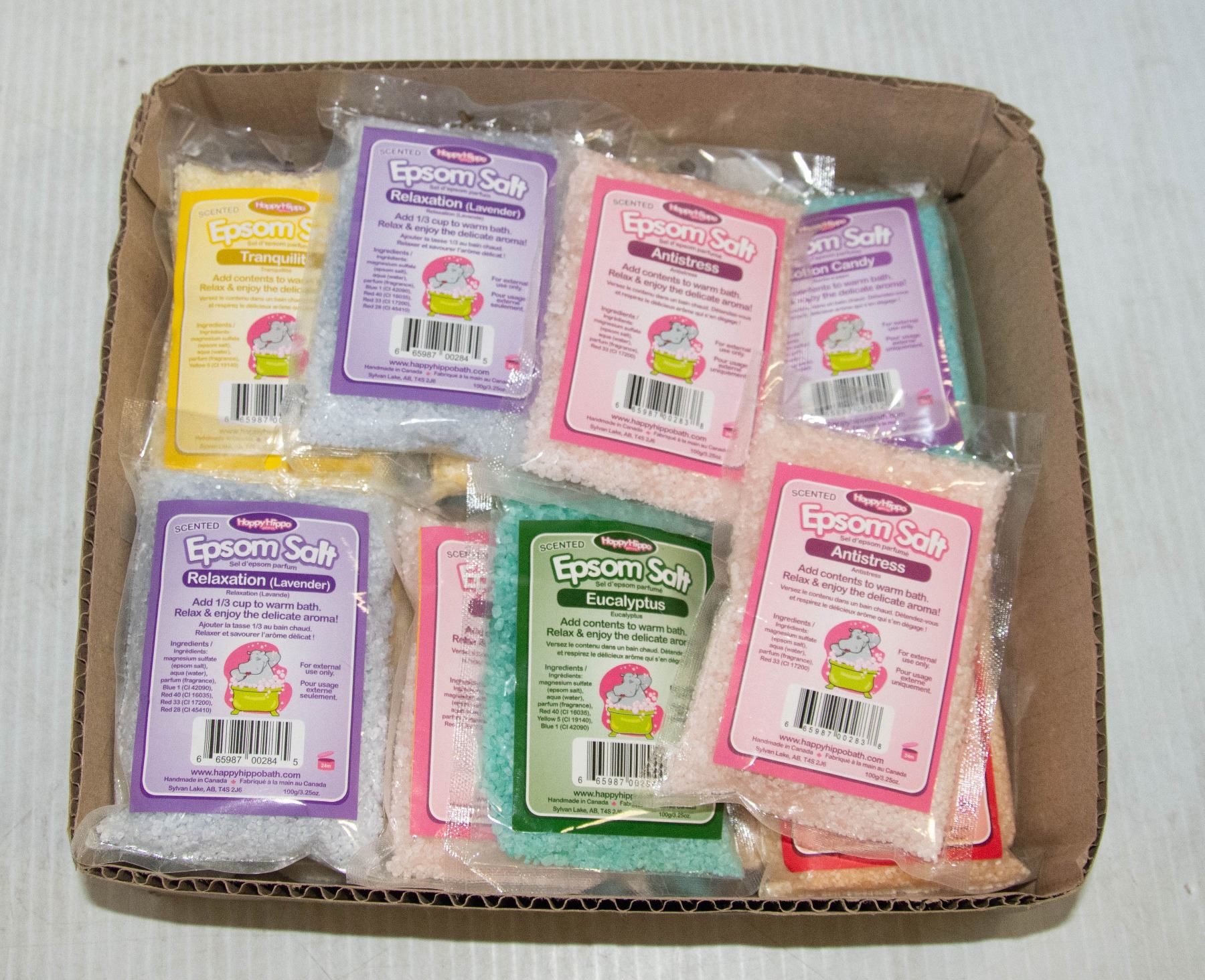 1 FLAT OF 18 INDIVIDUAL 100 GRAM PACKS OF HAPPY HIPPO EPSOM BATH SALTS ASSORTED SCENTS OF TRANQUILITY HAWAIIAN SUNRISE STRAWBERRIES AND CREAM VERY VANILLA COTTON CANDY PINK GRAPEFRUIT ANTI-STRESS TRIPLE BERRY + MORE**ALL ITEMS MUST BE REMOVED BY 5PM MONDAY, SEPTEMBER 17, 2022. ALL REMAINING ITEMS WILL BE SUBJECT TO A $6.00 PER DAY STORAGE CHARGE. ANY ITEMS REMAINING AFTER MONDAY, SEPTEMBER 17, 2022 WILL BE CONSIDERED FORFEITED. NO REFUNDS WILL BE ISSUED FOR FORFEITED ITEMS. TO SCHEDULE A PICK UP APPOINTMENT CLICK HERE