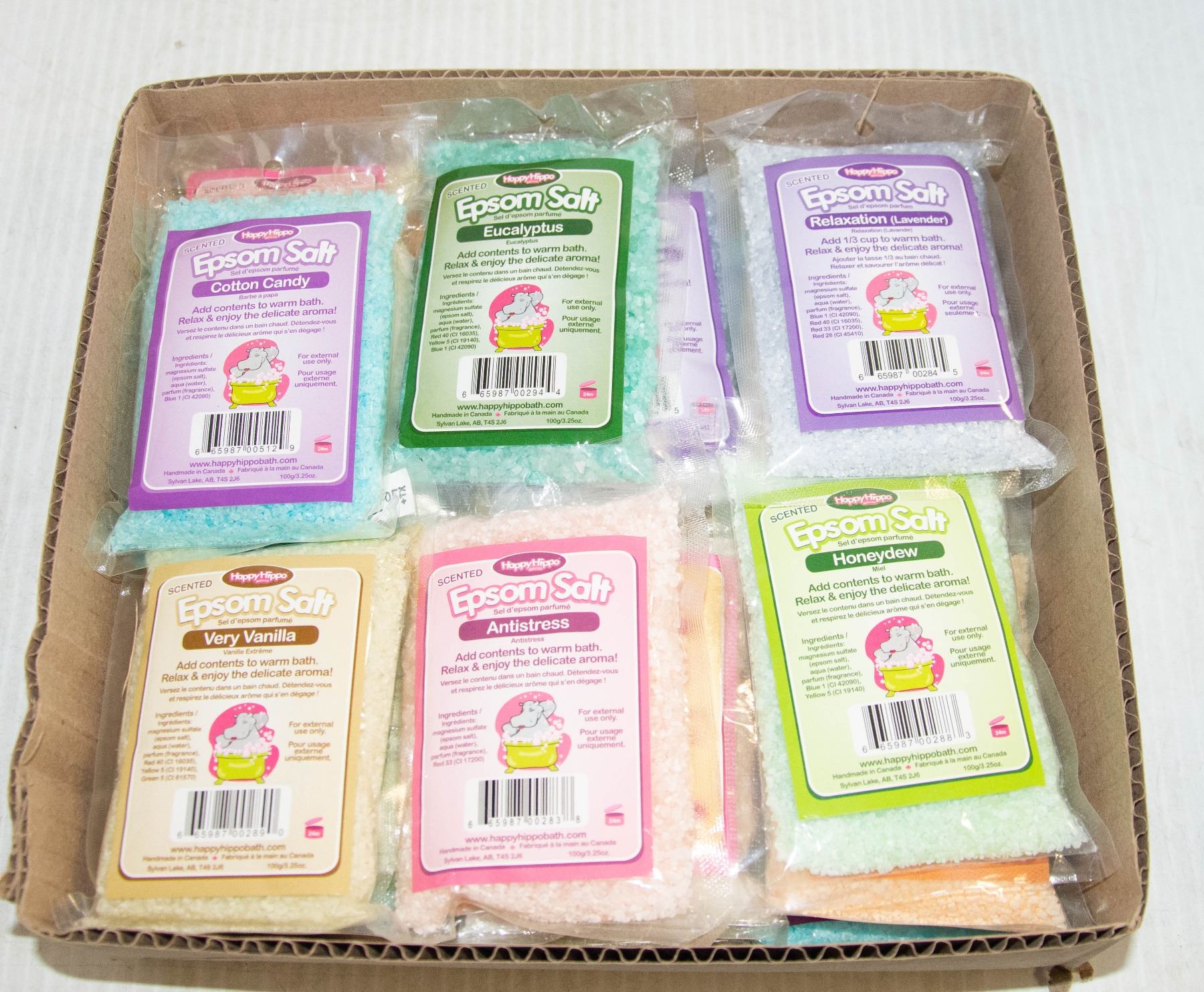 1 FLAT OF 18 INDIVIDUAL 100 GRAM PACKS OF HAPPY HIPPO EPSOM BATH SALTS ASSORTED SCENTS OF TRANQUILITY HAWAIIAN SUNRISE STRAWBERRIES AND CREAM VERY VANILLA COTTON CANDY PINK GRAPEFRUIT ANTI-STRESS TRIPLE BERRY HONEYDEW RELAXATION (LAVENDER) EUCALYPTUS**ALL ITEMS MUST BE REMOVED BY 5PM MONDAY, SEPTEMBER 17, 2022. ALL REMAINING ITEMS WILL BE SUBJECT TO A $6.00 PER DAY STORAGE CHARGE. ANY ITEMS REMAINING AFTER MONDAY, SEPTEMBER 17, 2022 WILL BE CONSIDERED FORFEITED. NO REFUNDS WILL BE ISSUED FOR FORFEITED ITEMS. TO SCHEDULE A PICK UP APPOINTMENT CLICK HERE