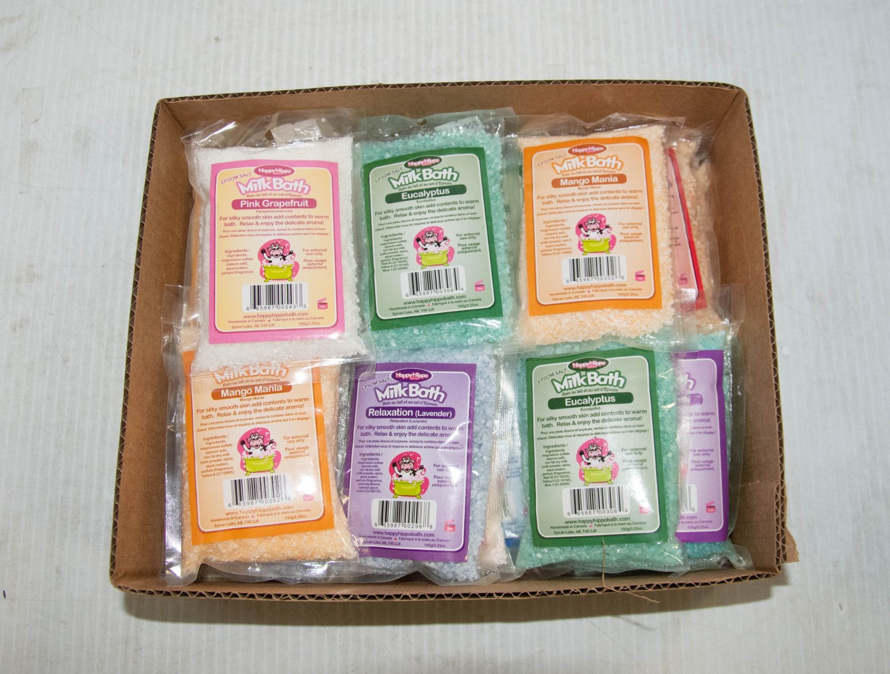 1 FLAT OF 18 INDIVIDUAL 100 GRAM PACKS OF HAPPY HIPPO MILK BATH SALTS ASSORTED SCENTS OF ANTI-STRESS EUCALYPTUS TRIPLE BERRY HONEYDEW PINK GRAPEFRUIT HAWAIIAN SUNRISE STRAWBERRIES AND CREAM RELAXATION (LAVENDER) COTTON CANDY MANGO MANIA VERY VANILLA**ALL ITEMS MUST BE REMOVED BY 5PM MONDAY, SEPTEMBER 17, 2022. ALL REMAINING ITEMS WILL BE SUBJECT TO A $6.00 PER DAY STORAGE CHARGE. ANY ITEMS REMAINING AFTER MONDAY, SEPTEMBER 17, 2022 WILL BE CONSIDERED FORFEITED. NO REFUNDS WILL BE ISSUED FOR FORFEITED ITEMS. TO SCHEDULE A PICK UP APPOINTMENT CLICK HERE