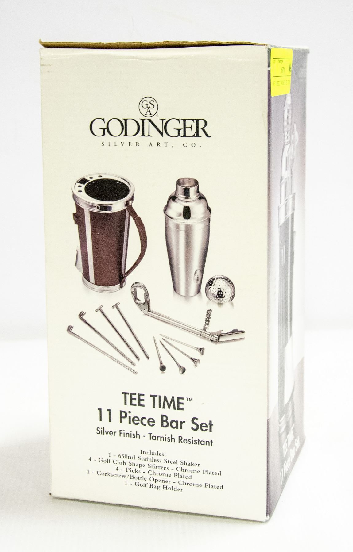 NEW IN BOX 11 PIECE BAR SET - TEE TIME THEME BY GODINGER SILVER ART CO. IN SILVER FINISH AND IS TARNISH RESISTANT. INCLUDES 1 - 650 ML STAINLESS STEEL SHAKER, 4 - GOLF CLUB SHAPE STIRRERS (CHROME PLATED), 4 - PICKS (CHROME PLATED), 1 - CORKSCREW/BO