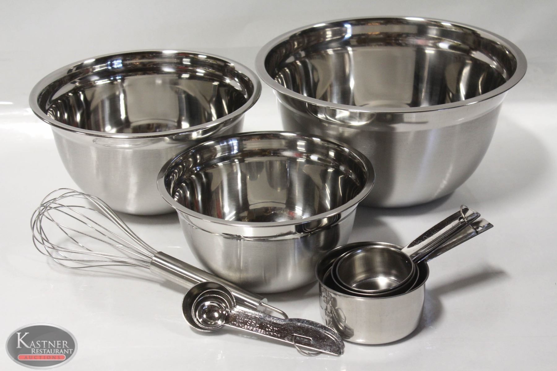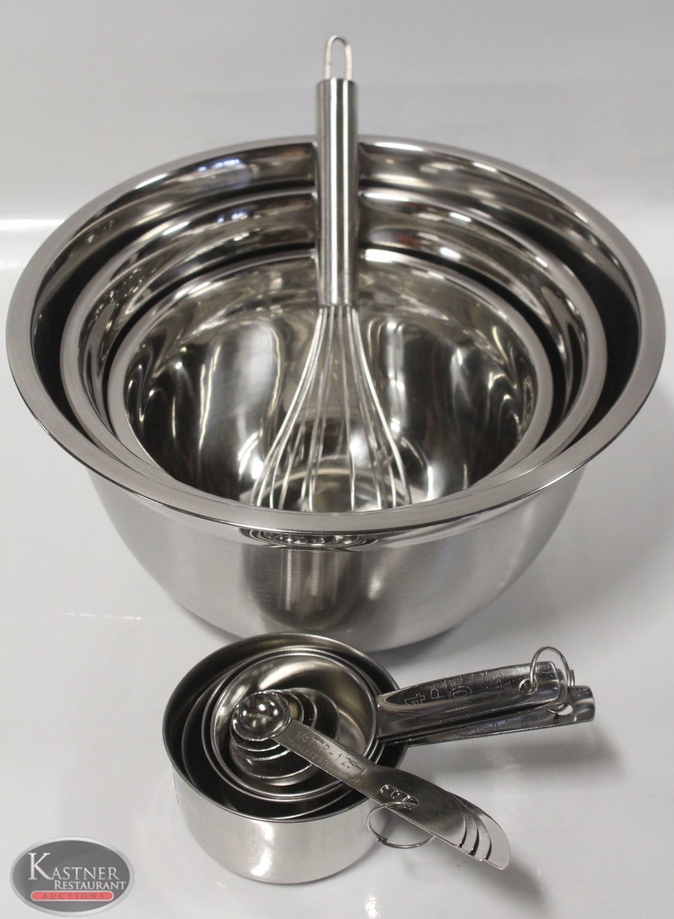 INCLUDES 3 MIXING BOWLS (1-1/2 QT, 2-1/2 QT, & 4-1/2 QT), MEASURING SPOONS (1/4 TEASPOON, 1/2 TEASPOON, 1 TEASPOON & 1 TABLESPOON), MEASURING CUPS (1/4 CUP, 1/3 CUP, 1/2 CUP, 1 CUP), & 10" WIRE WHIP.