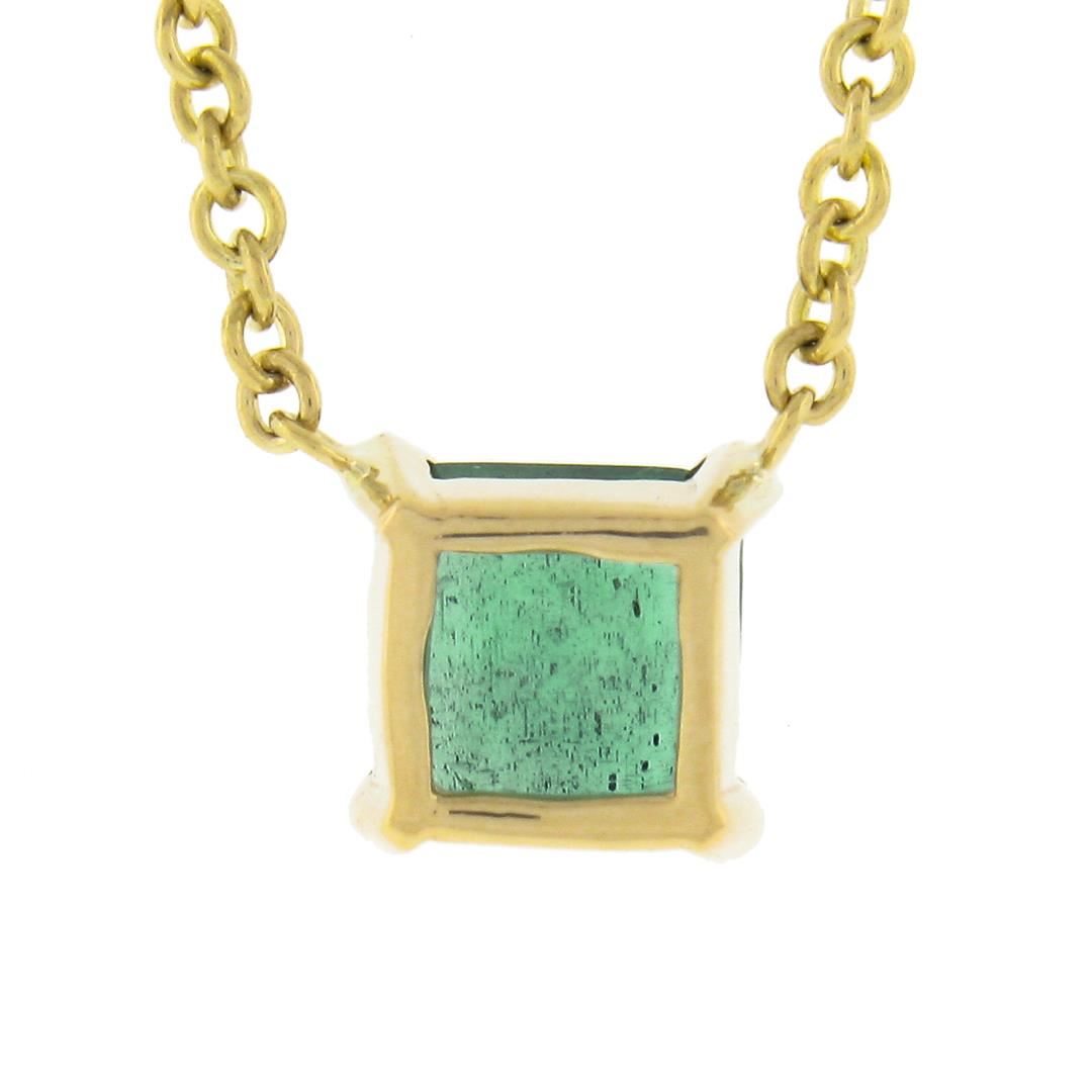 A new solid 14k yellow gold pendant necklace, with 1 square cut natural emerald (0.59ct). Adjustable 16 and 18 inch cable link chain, 2.70 grams total weight, pendant measures 5.7x5.6mm.