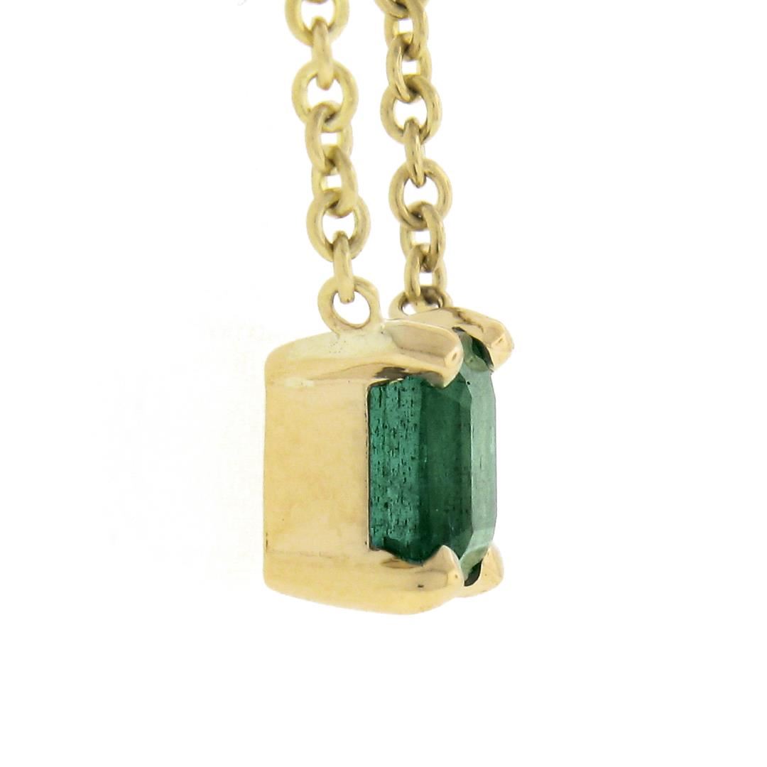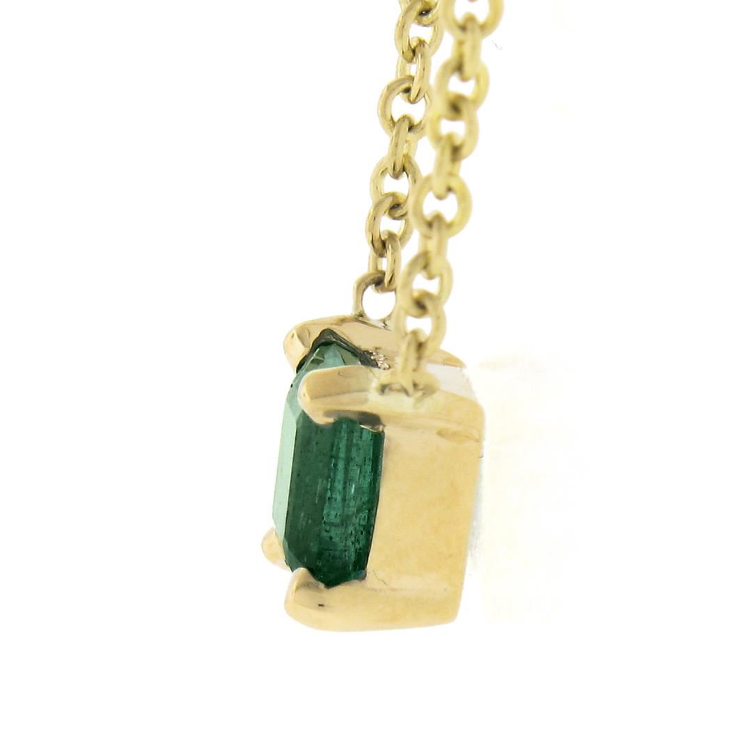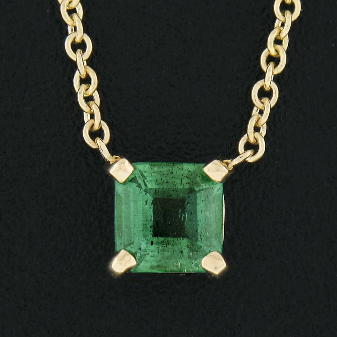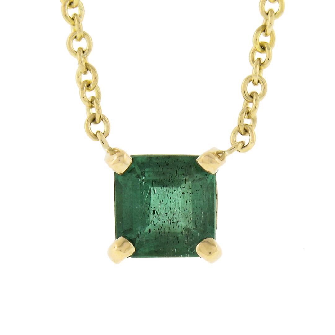 A new solid 14k yellow gold pendant necklace, with 1 square cut natural emerald (0.59ct). Adjustable 16 and 18 inch cable link chain, 2.70 grams total weight, pendant measures 5.7x5.6mm.