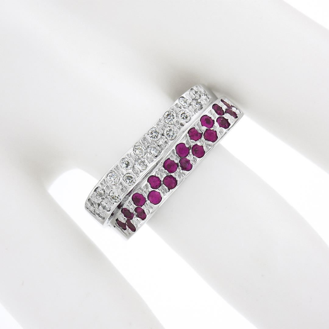 A new solid 14k white gold stack look wavy band ring, with 20 round cut natural diamonds (G/H - VS1/VS2 ; 0.30ctw), and 20 round cut natural rubies (0.55ctw ). The ring is size 6.5, weighs a total of 8.23 grams, and measures 7.5mm wide.