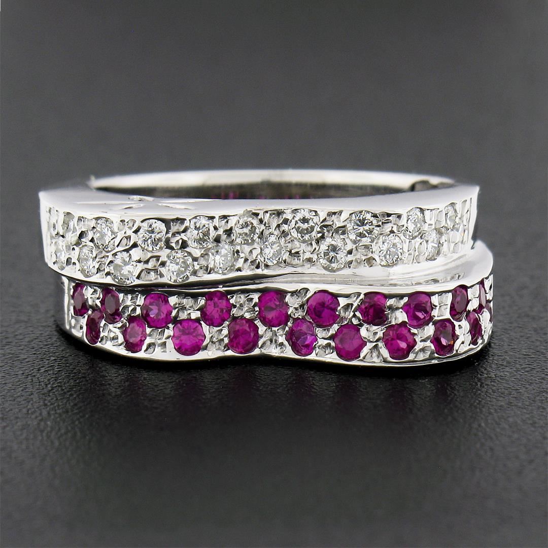 A new solid 14k white gold stack look wavy band ring, with 20 round cut natural diamonds (G/H - VS1/VS2 ; 0.30ctw), and 20 round cut natural rubies (0.55ctw ). The ring is size 6.5, weighs a total of 8.23 grams, and measures 7.5mm wide.