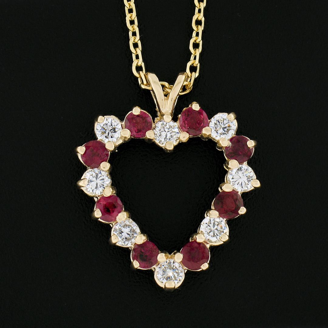 A new solid 14k yellow gold heart pendant necklace, with 8 round brilliant cut natural diamonds (H/I - VS1/VS2 ; 0.60ctw ), alternated with 8 round brilliant cut natural rubies (0.90ctw). 18 inch cable link chain, 5.46 grams total weight, pendant measures 22.80x19mm.