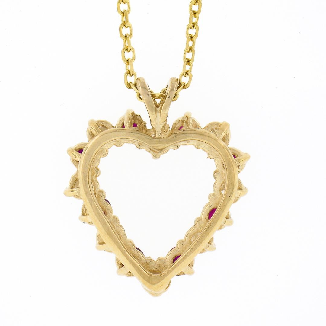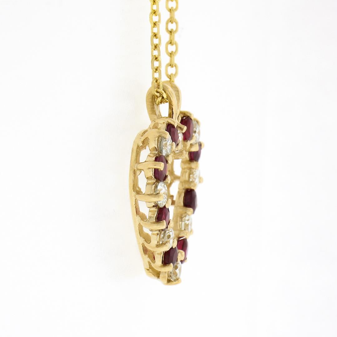 A new solid 14k yellow gold heart pendant necklace, with 8 round brilliant cut natural diamonds (H/I - VS1/VS2 ; 0.60ctw ), alternated with 8 round brilliant cut natural rubies (0.90ctw). 18 inch cable link chain, 5.46 grams total weight, pendant measures 22.80x19mm.