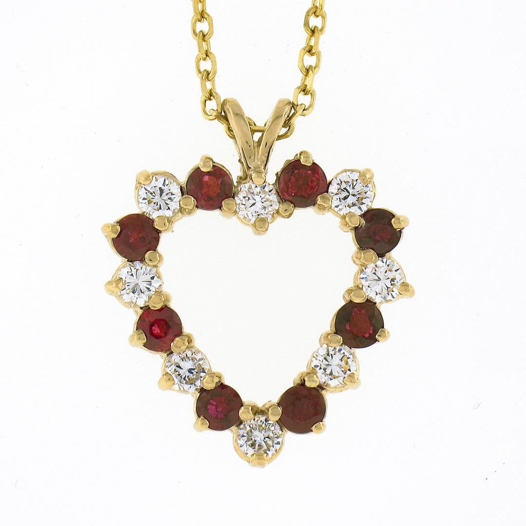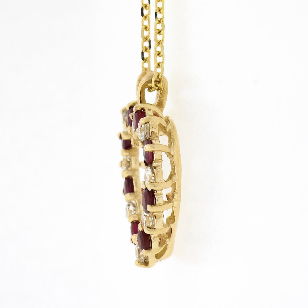 A new solid 14k yellow gold heart pendant necklace, with 8 round brilliant cut natural diamonds (H/I - VS1/VS2 ; 0.60ctw ), alternated with 8 round brilliant cut natural rubies (0.90ctw). 18 inch cable link chain, 5.46 grams total weight, pendant measures 22.80x19mm.