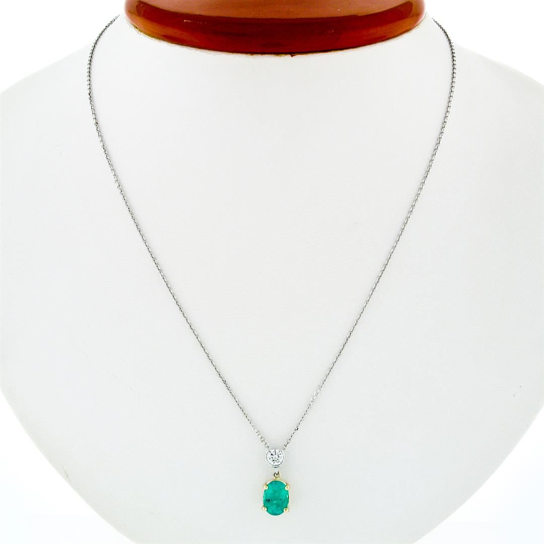 A new solid 14k yellow & white gold pendant necklace, with 1 oval brilliant cut natural emerald (1.22ct ), and 1 round brilliant cut natural diamond (H - VS2 ; 0.22ct). The pendant weighs a total of 2.80 grams, measures 15.30x6.70mm including the bail, and adjustable to 16 or 18 inch cable link chain.