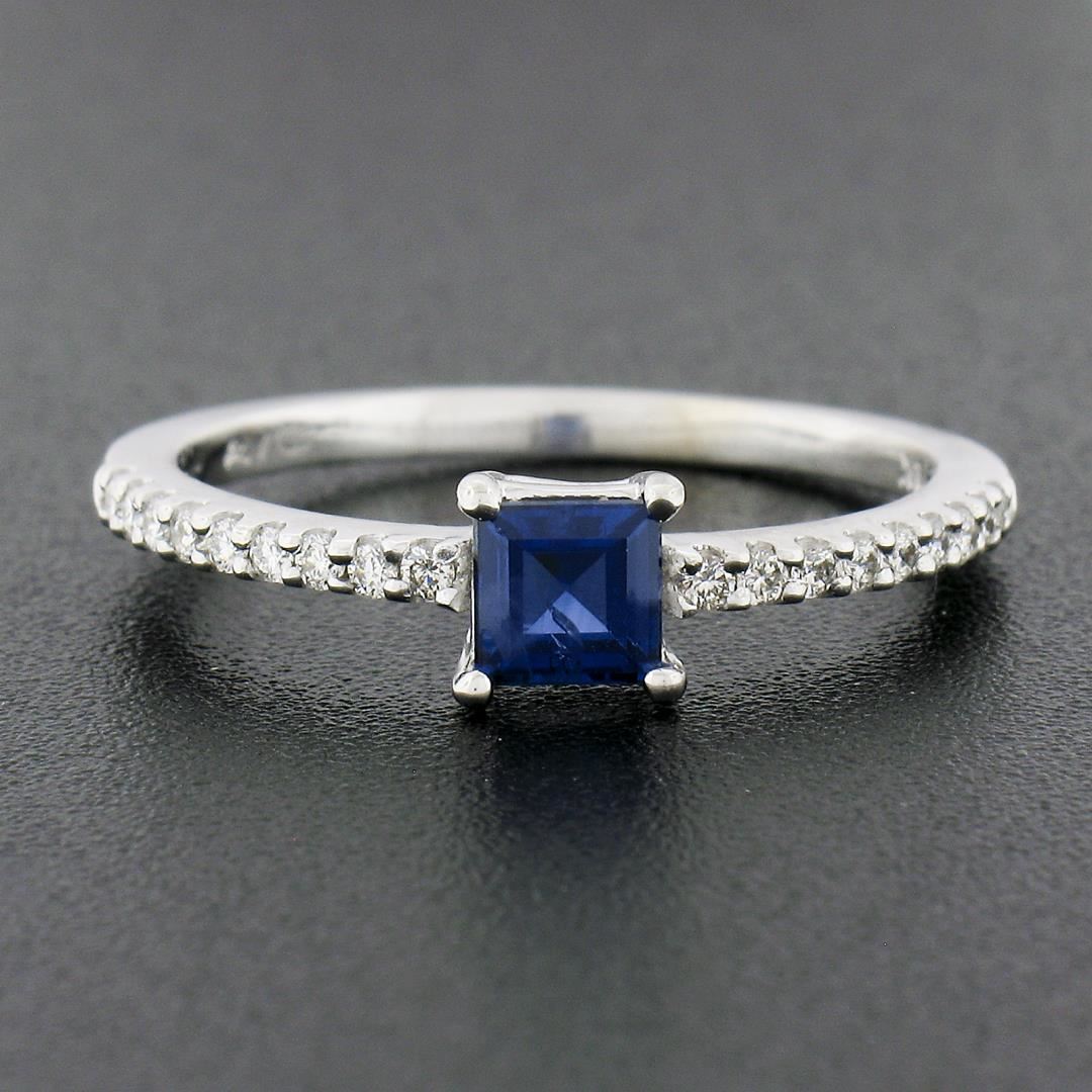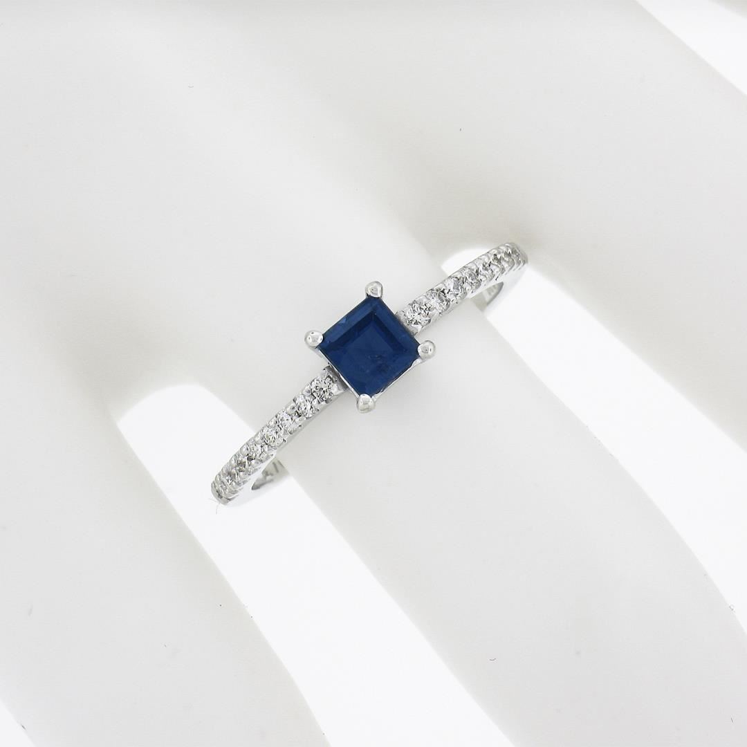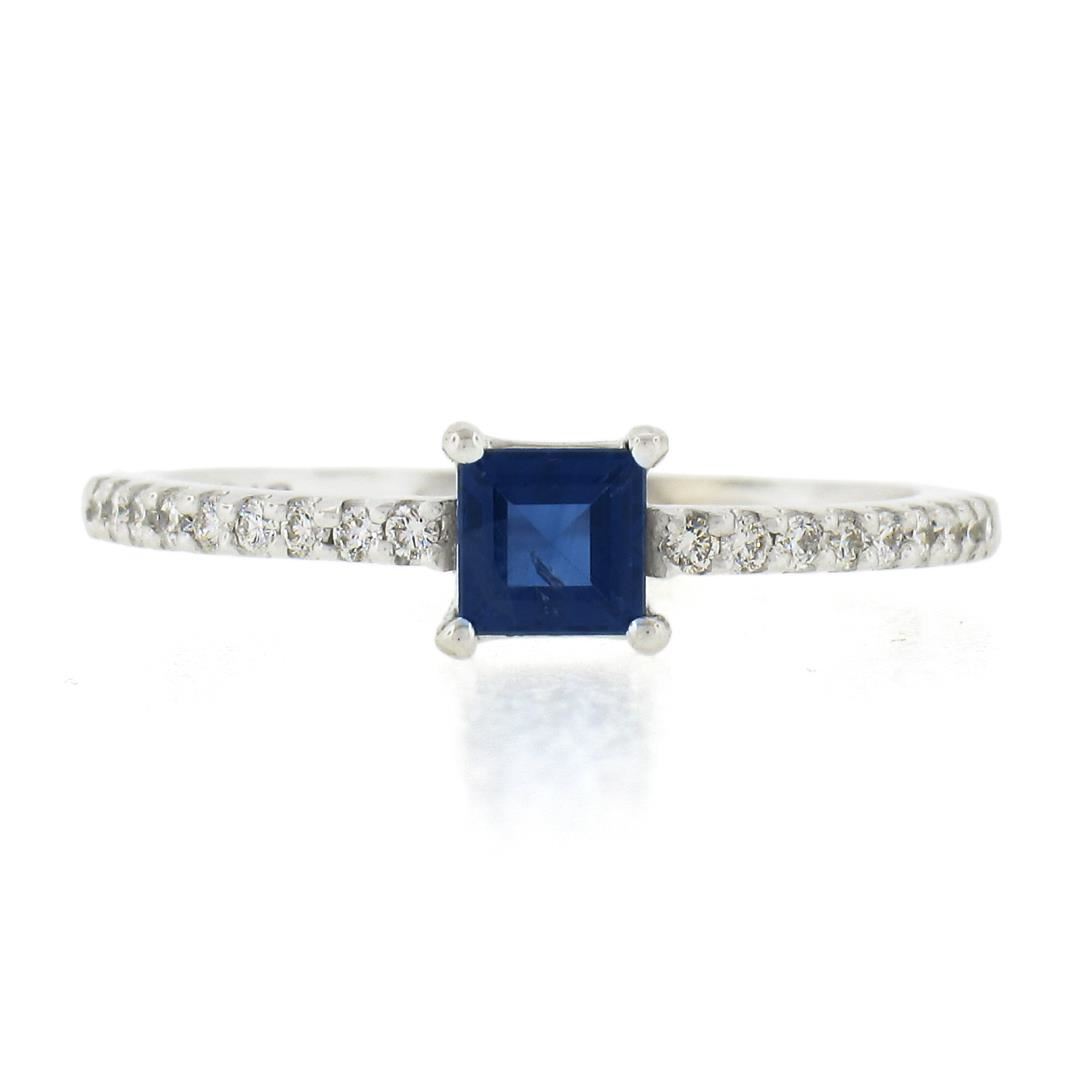 A new solid 14k white gold ring, with 1 square cut natural sapphire (0.45ct), and 18 round cut natural diamonds (F/G - VS1-VS2 ; 0.18ctw). The ring is size 7.5, weighs a total of 1.97 grams, and measures 5.35mm wide.