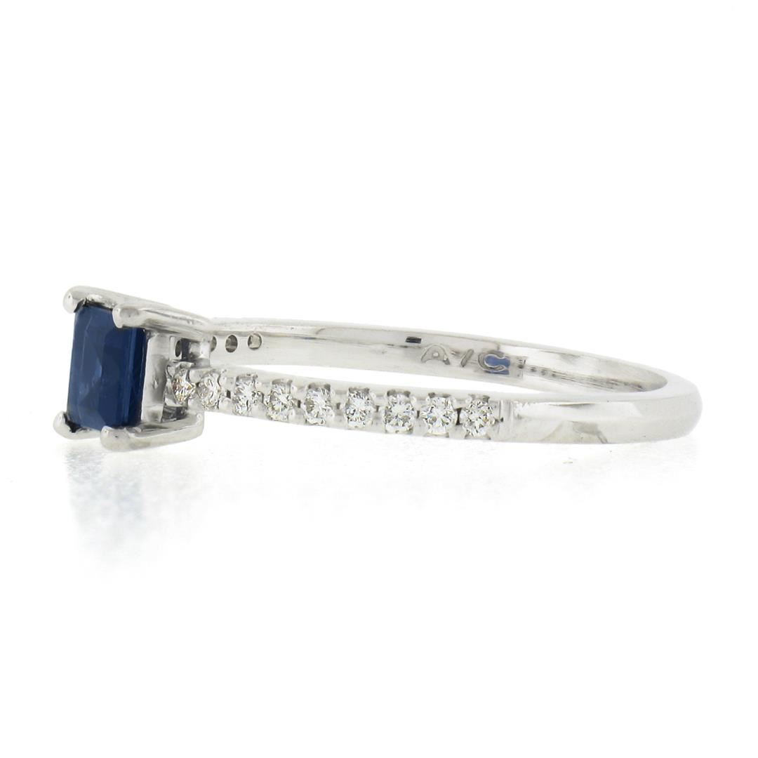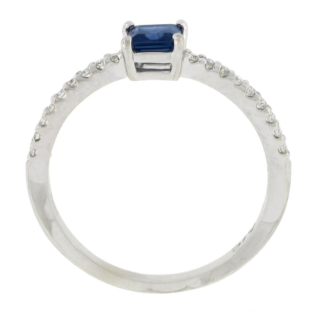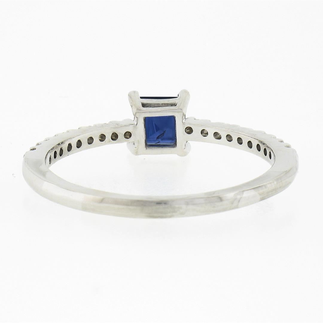 A new solid 14k white gold ring, with 1 square cut natural sapphire (0.45ct), and 18 round cut natural diamonds (F/G - VS1-VS2 ; 0.18ctw). The ring is size 7.5, weighs a total of 1.97 grams, and measures 5.35mm wide.