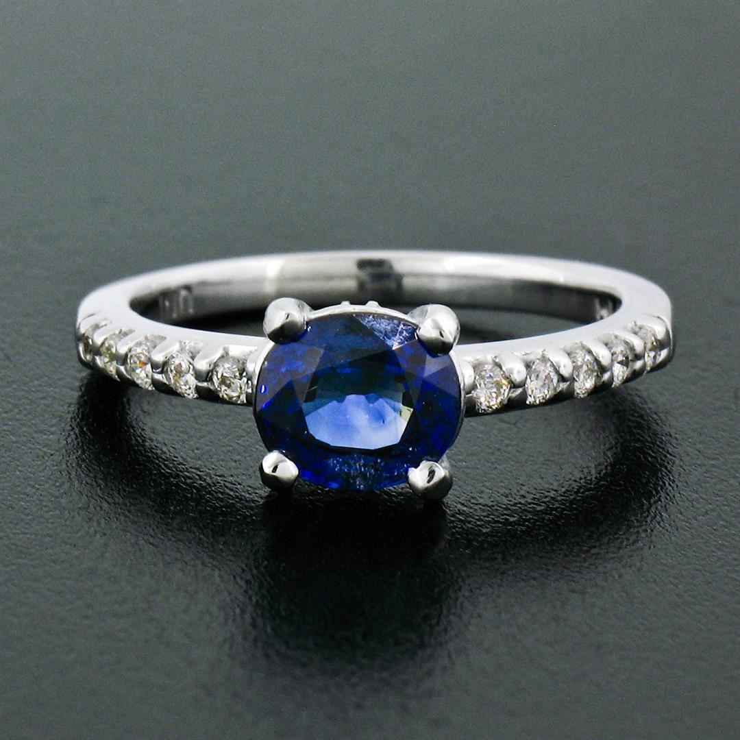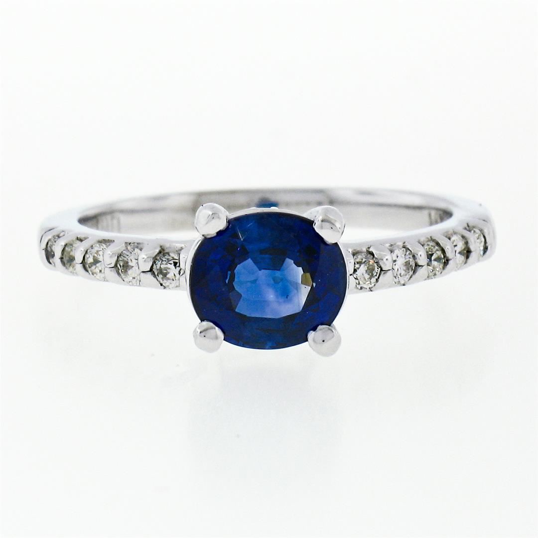 A new solid 14k white gold solitaire engagement ring, with 1 Gia certified oval cut naural sapphire (6.46 x 5.70 x 3.51 mm- 1.15ct), and 10 round brilliant cut natural diamonds (G/H - VS1/VS2; 0.15ctw). The ring is size 5.0, weighs a total of 2.46 grams, and measures 6.15mm wide. Comes with all original relevant certifications.