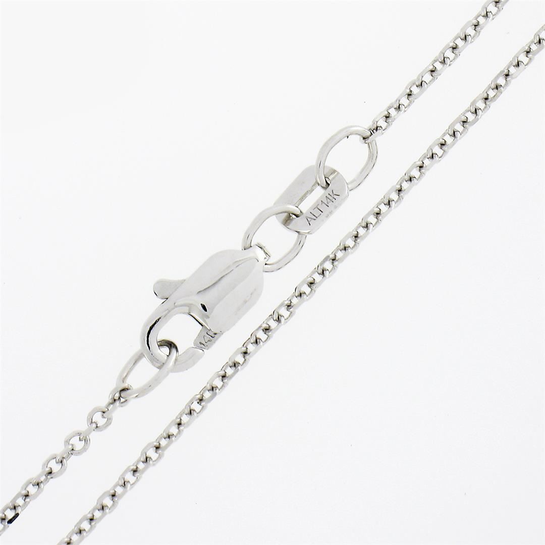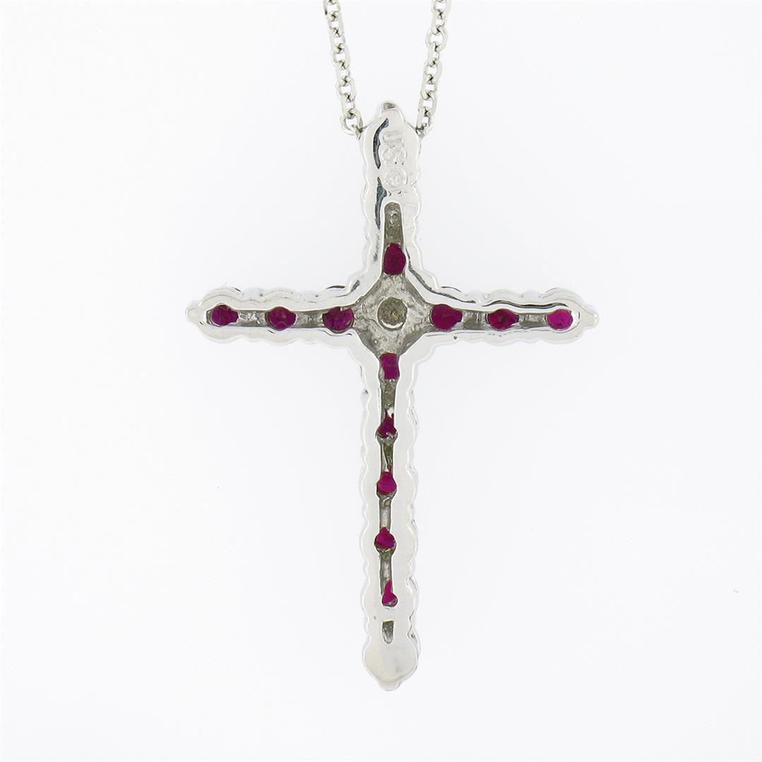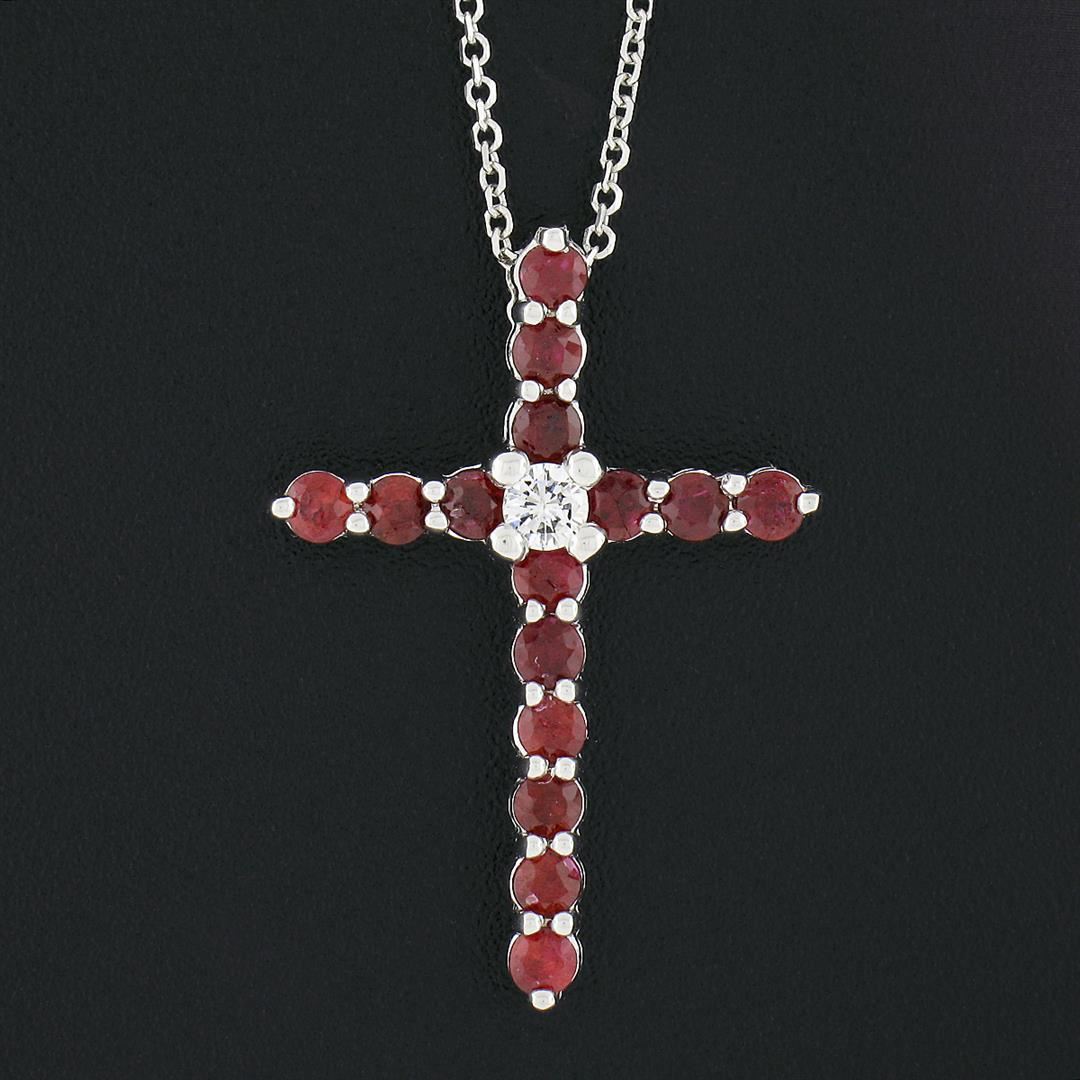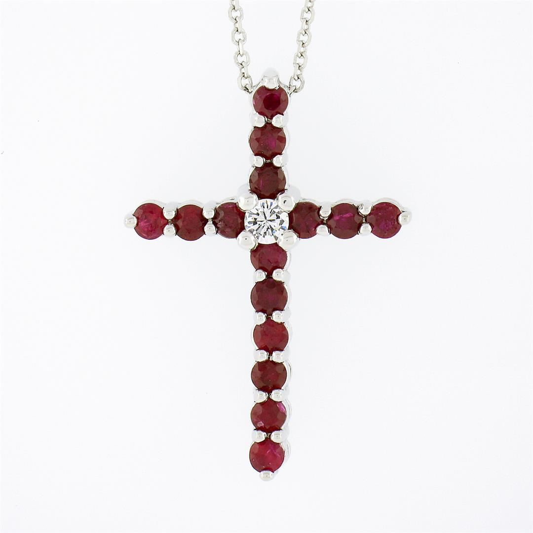 A new solid 14k white gold cross pendant necklace, with 15 round brilliant cut natural rubies (1.54ctw), and 1 round brilliant cut natural diamond (H - VS2 ; 0.16ct ). 18 inch cable link chain, 5.40 grams total weight, pendant measures 29.60x20.65mm.