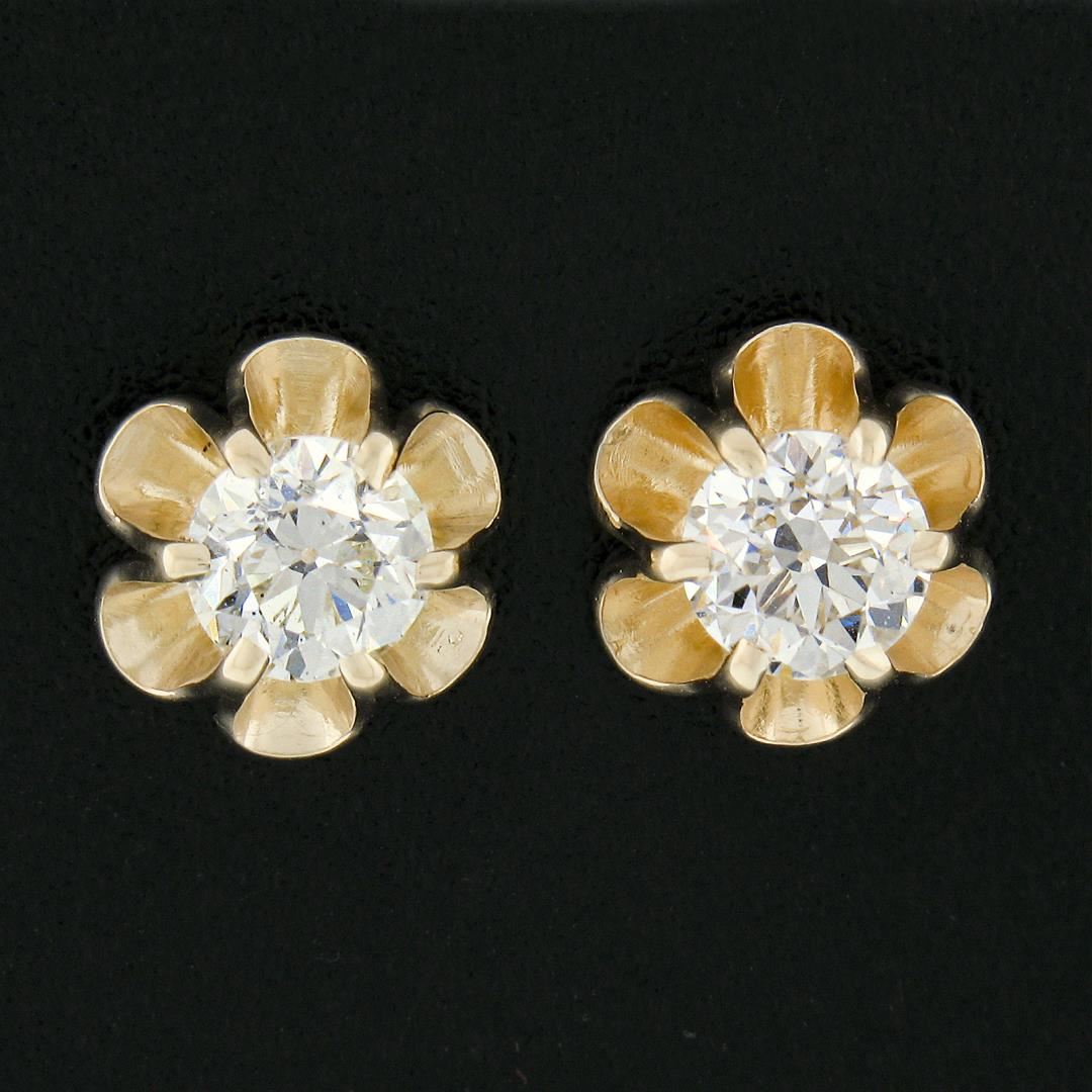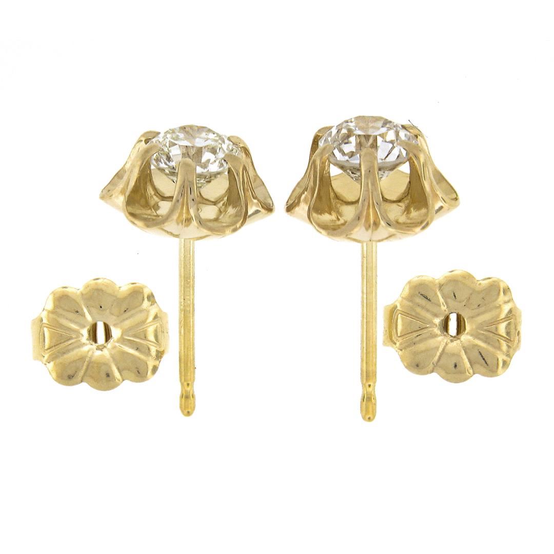 A new solid 14k yellow gold flower stud earrings, featuring 2 old European cu natural diamonds (H/I - VS1/VS2; 0.76ctw). The earrings measure approximately 7.9mm in diameter and weigh a total of 1.57 grams.
