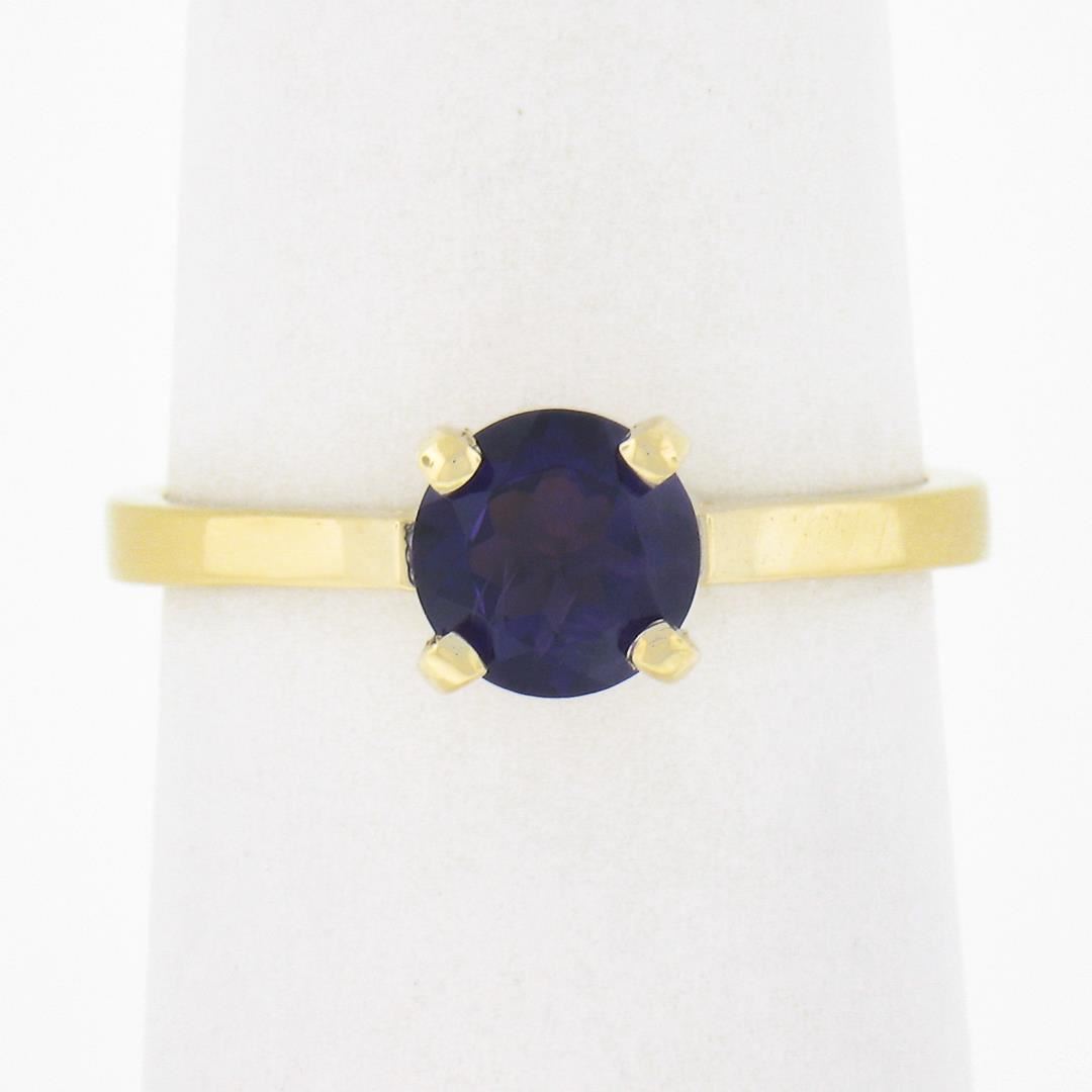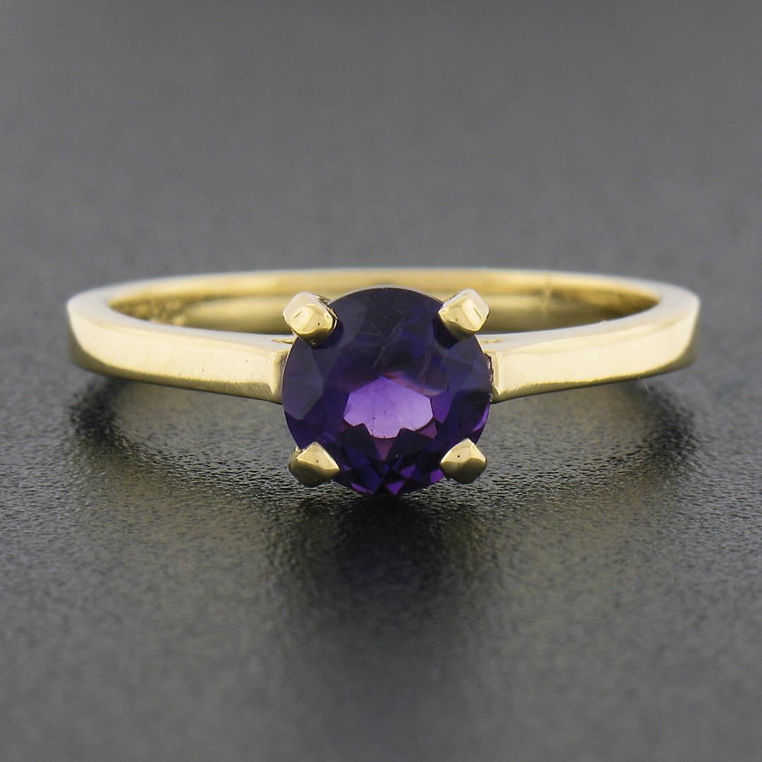 A new solid 14k yellow gold solitaire ring, with 1 round cut natural amethyst (1.03ct). The ring is size 6.0, weighs a total of 2.38 grams, and measures 5.95mm wide.