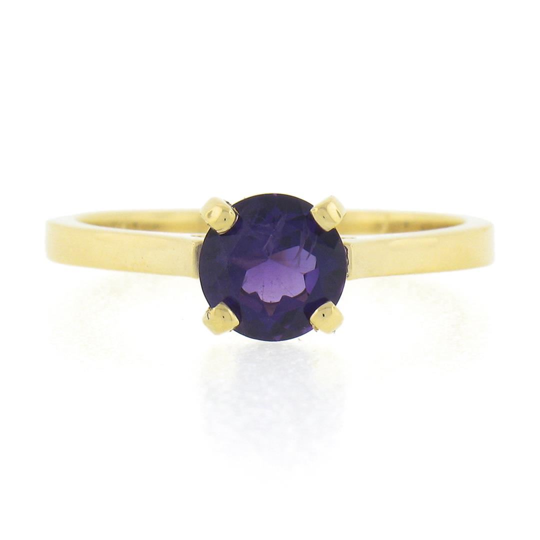 A new solid 14k yellow gold solitaire ring, with 1 round cut natural amethyst (1.03ct). The ring is size 6.0, weighs a total of 2.38 grams, and measures 5.95mm wide.