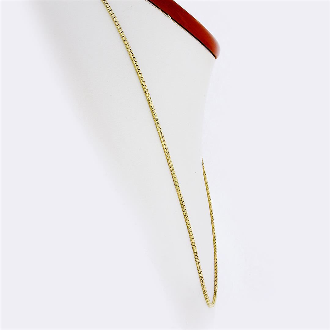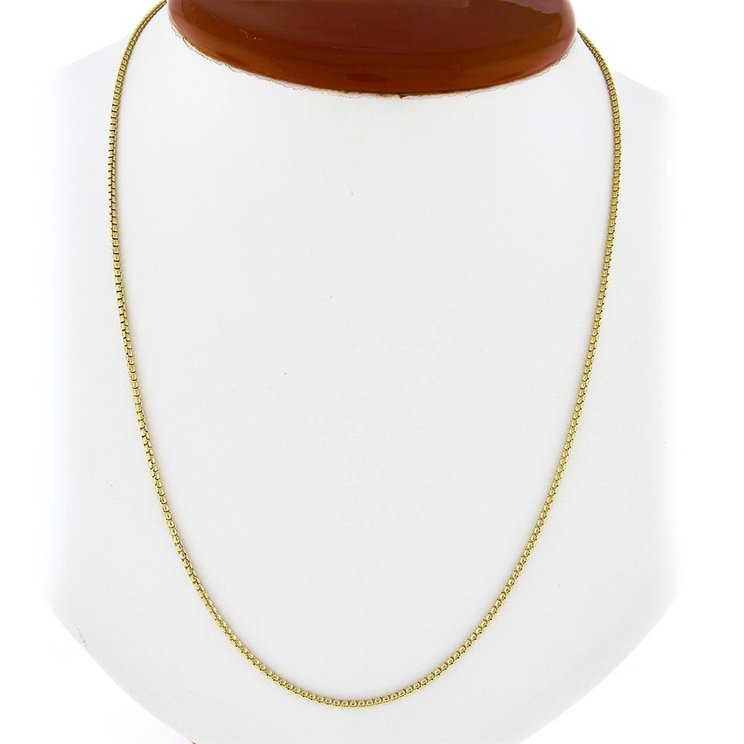 A new solid 14k yellow gold chain necklace. It weighs a total of 6.71 grams, measures 1.55mm wide, and measures 18 inches in length.