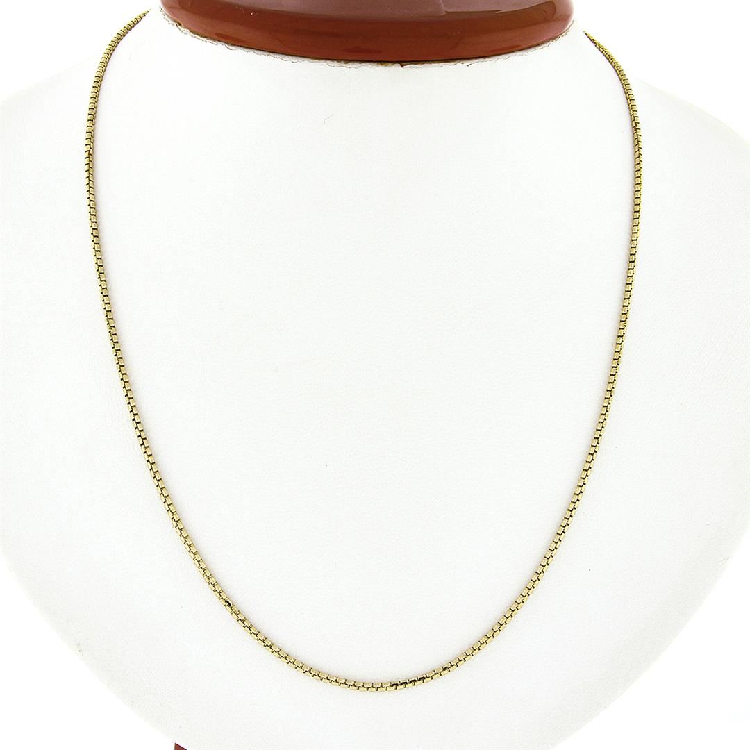 A new solid 14k yellow gold box link chain necklace. It weighs a total of 6.62 grams, measures 1.6mm wide, and measures 18 inches in length.