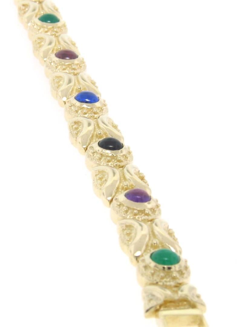 A new Solid 14k yellow gold textured tennis bracelet, featuring round cabochon cut 2 natural agates, 2 natural amethysts, 2 natural onyx, 1 natural garnet & 1 man made sapphire (5.40 mm). It weighs a total of 26.10 grams, measures 9.9mm wide, and measures 7 inches in length.