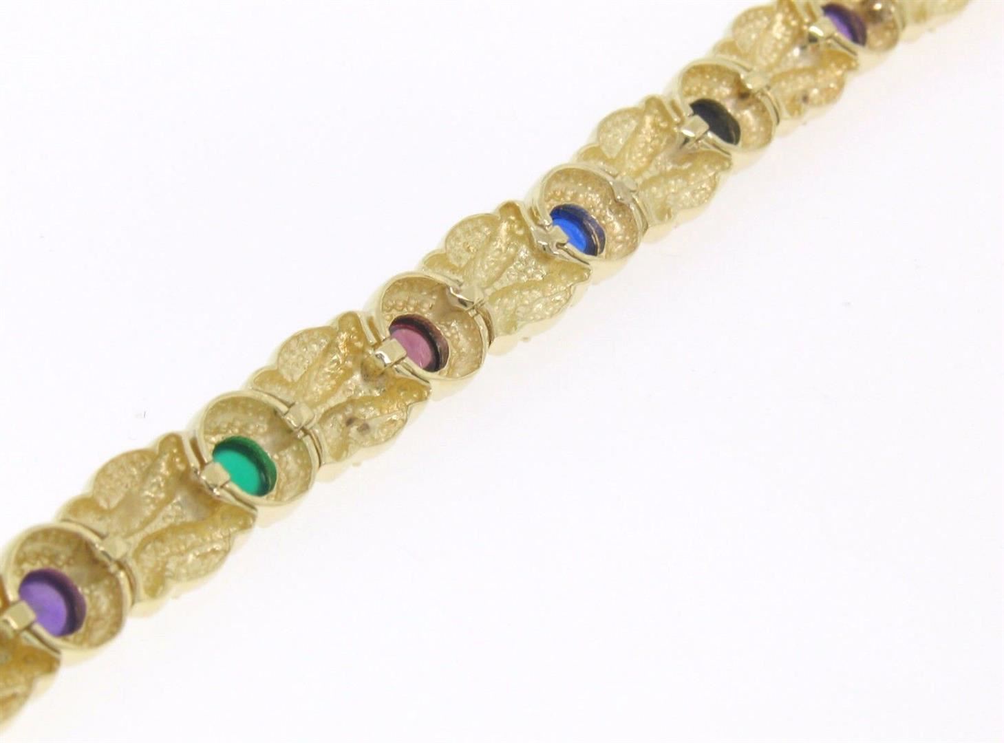 A new Solid 14k yellow gold textured tennis bracelet, featuring round cabochon cut 2 natural agates, 2 natural amethysts, 2 natural onyx, 1 natural garnet & 1 man made sapphire (5.40 mm). It weighs a total of 26.10 grams, measures 9.9mm wide, and measures 7 inches in length.