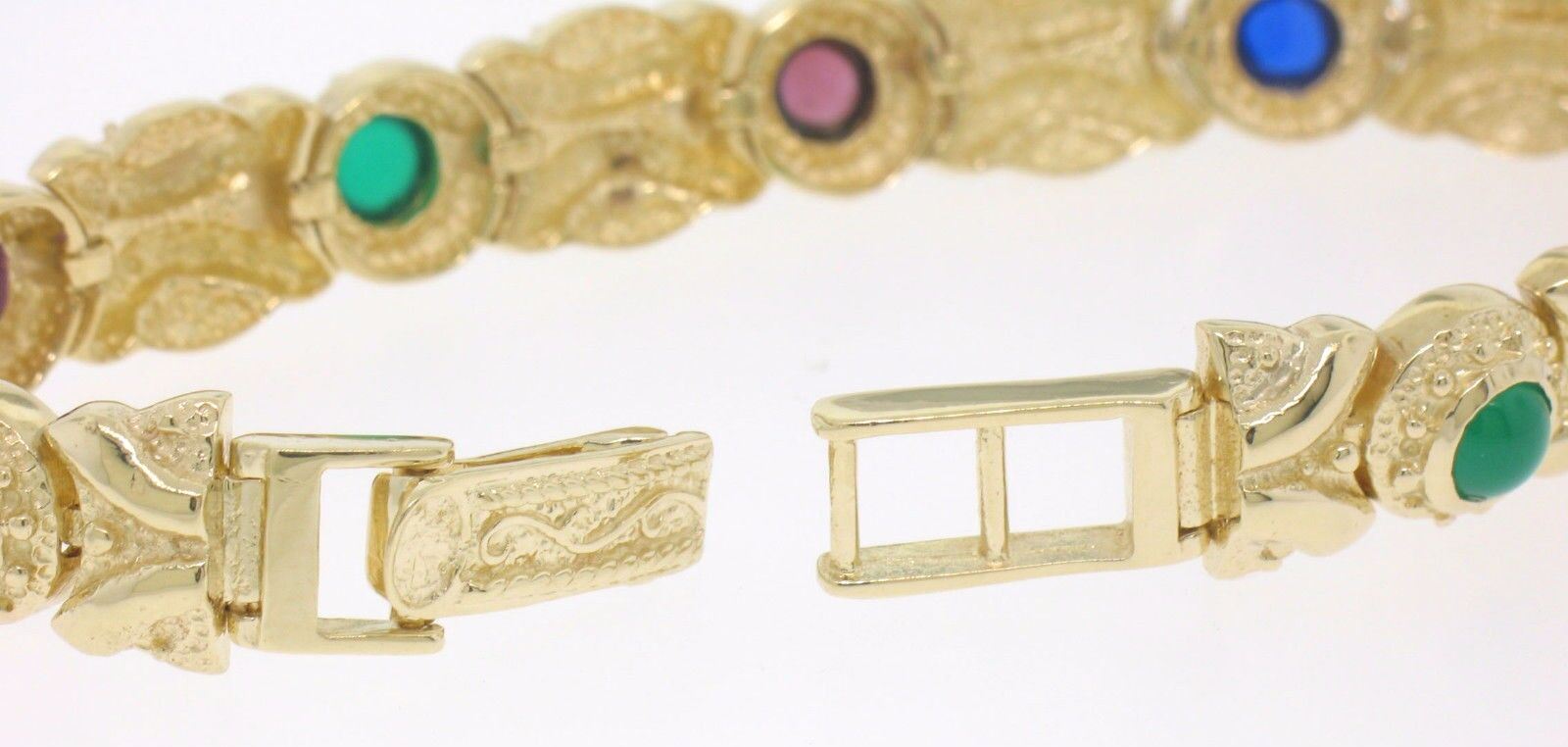 A new Solid 14k yellow gold textured tennis bracelet, featuring round cabochon cut 2 natural agates, 2 natural amethysts, 2 natural onyx, 1 natural garnet & 1 man made sapphire (5.40 mm). It weighs a total of 26.10 grams, measures 9.9mm wide, and measures 7 inches in length.