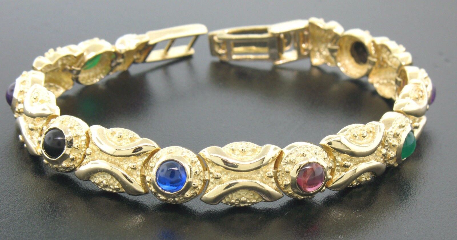 A new Solid 14k yellow gold textured tennis bracelet, featuring round cabochon cut 2 natural agates, 2 natural amethysts, 2 natural onyx, 1 natural garnet & 1 man made sapphire (5.40 mm). It weighs a total of 26.10 grams, measures 9.9mm wide, and measures 7 inches in length.