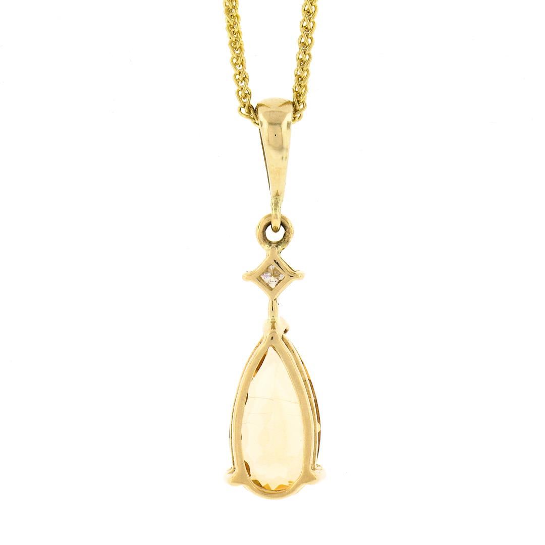 A new solid 14k yellow gold pendant necklace, with 1 pear cut natural imperial topaz (1.50ct), and 1 round brilliant cut natural diamond (F - VS2 ; 0.06ct). 18 inch wheat link chain, 3.27 grams total weight, pendant measures 25x6.60mm.
