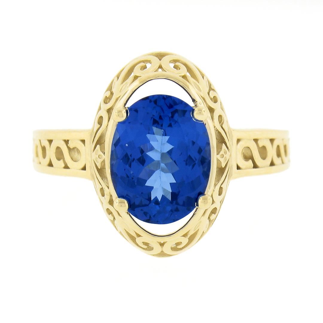 A new solid 14k yellow gold ring, with 1 oval cut natural tanzanite (2.0ct). The ring is size 7.0, weighs a total of 3.60 grams, and measures 14.9mm wide.