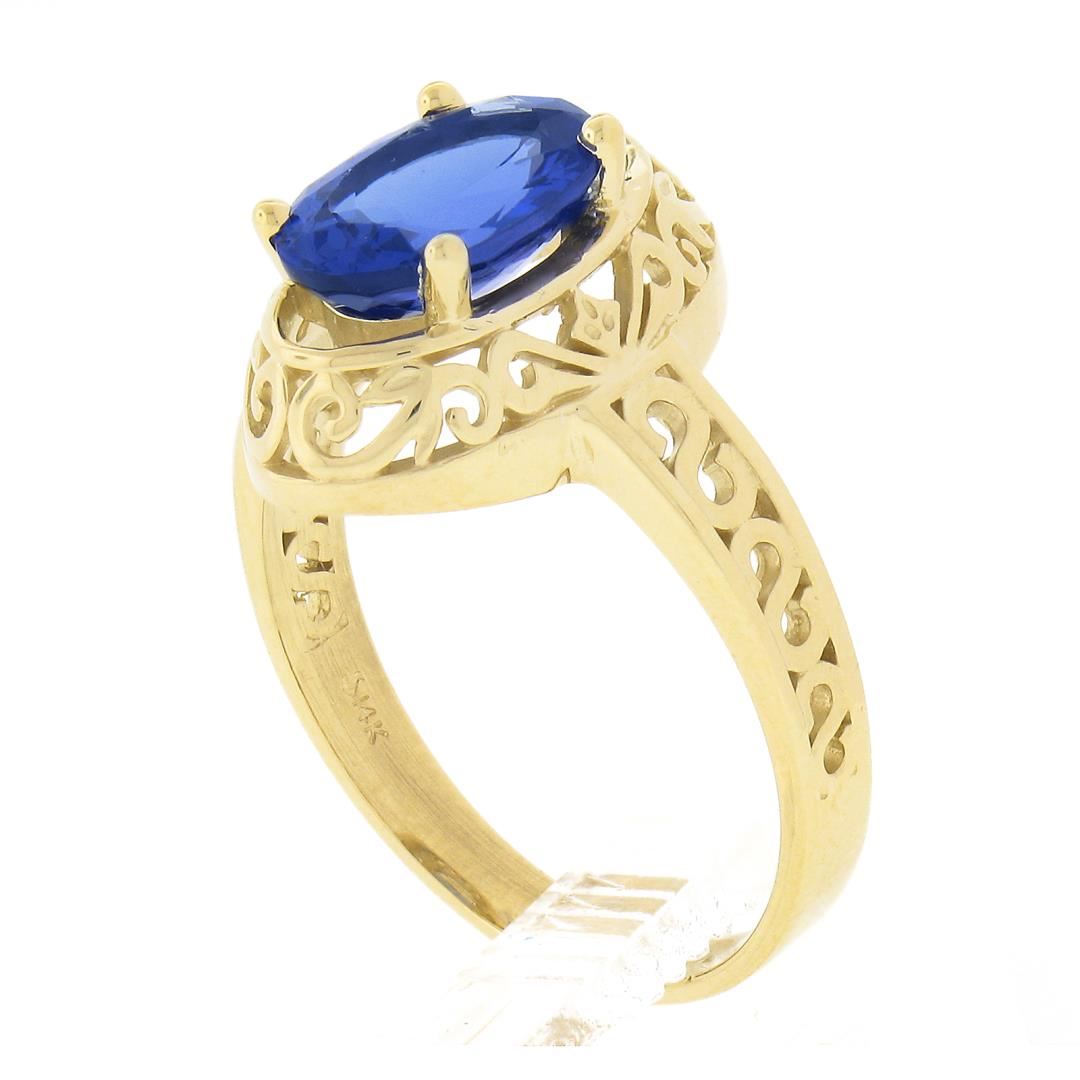 A new solid 14k yellow gold ring, with 1 oval cut natural tanzanite (2.0ct). The ring is size 7.0, weighs a total of 3.60 grams, and measures 14.9mm wide.