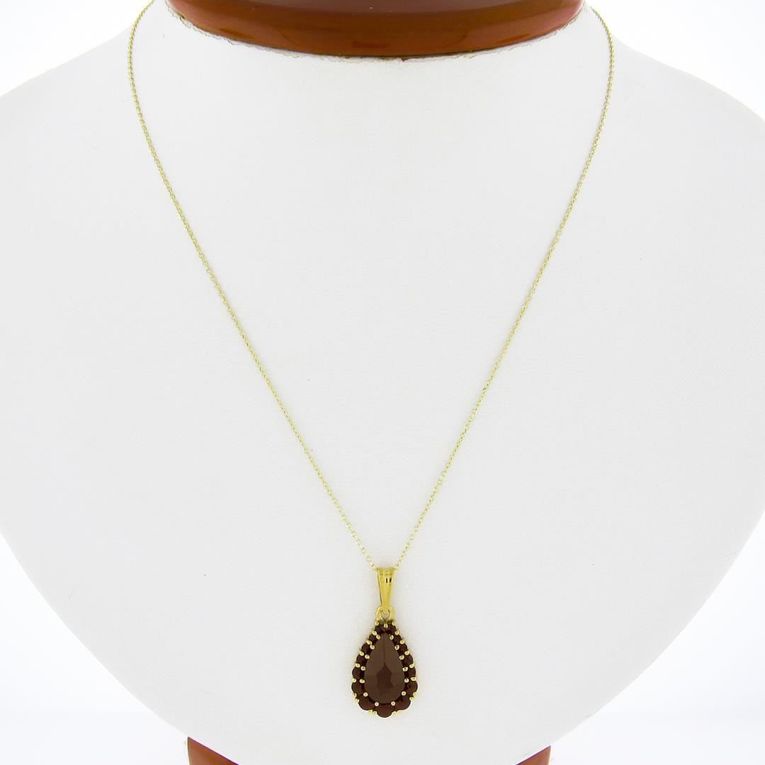 A new solid 14k yellow gold pendant necklace, with 1 pear cut natural garnet (12.1x7mm / 2.0ct), surrounded with a halo of round rose cut natural garnets (1.03ctw (). Adjustable 16 & 18 inch cable link chain, 3.20 grams total weight, pendant measures 25.1x11.3mm.