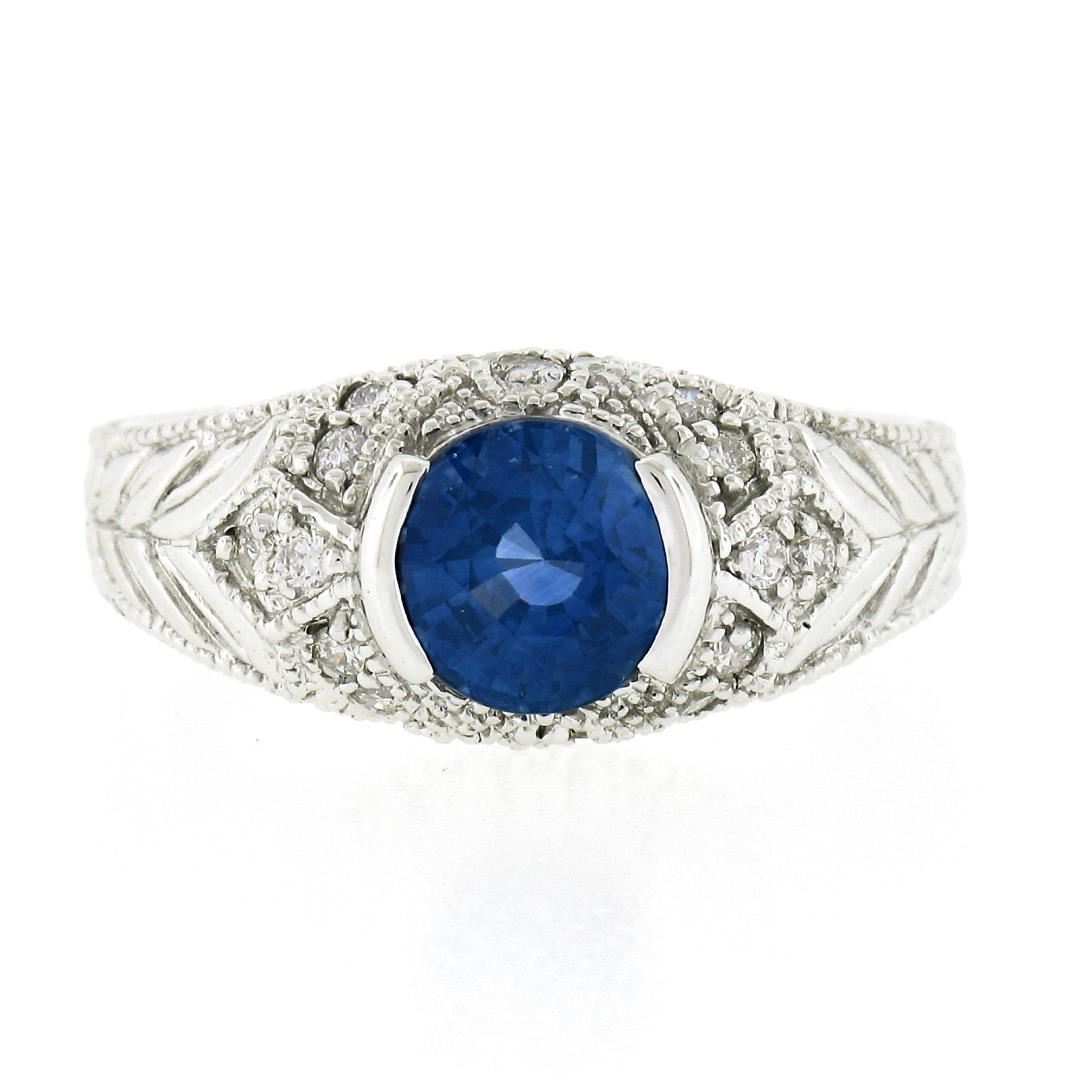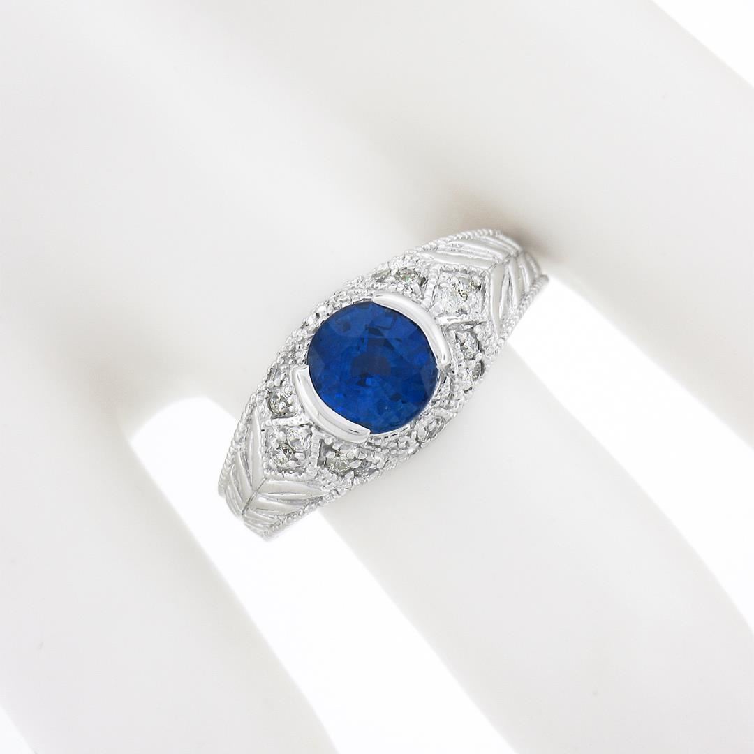 A new solid 14k white godl ring, with 1 GIA graded round natrual sapphire (1.65ct ), and 18 round brilliant cut natural diamonds (F/G - VS2/SI1 ; 0.18ctw. The ring is size 6.5, weighs a total of 6.42 grams, and measures 9.4mm wide. Comes with all original relevant certifications.