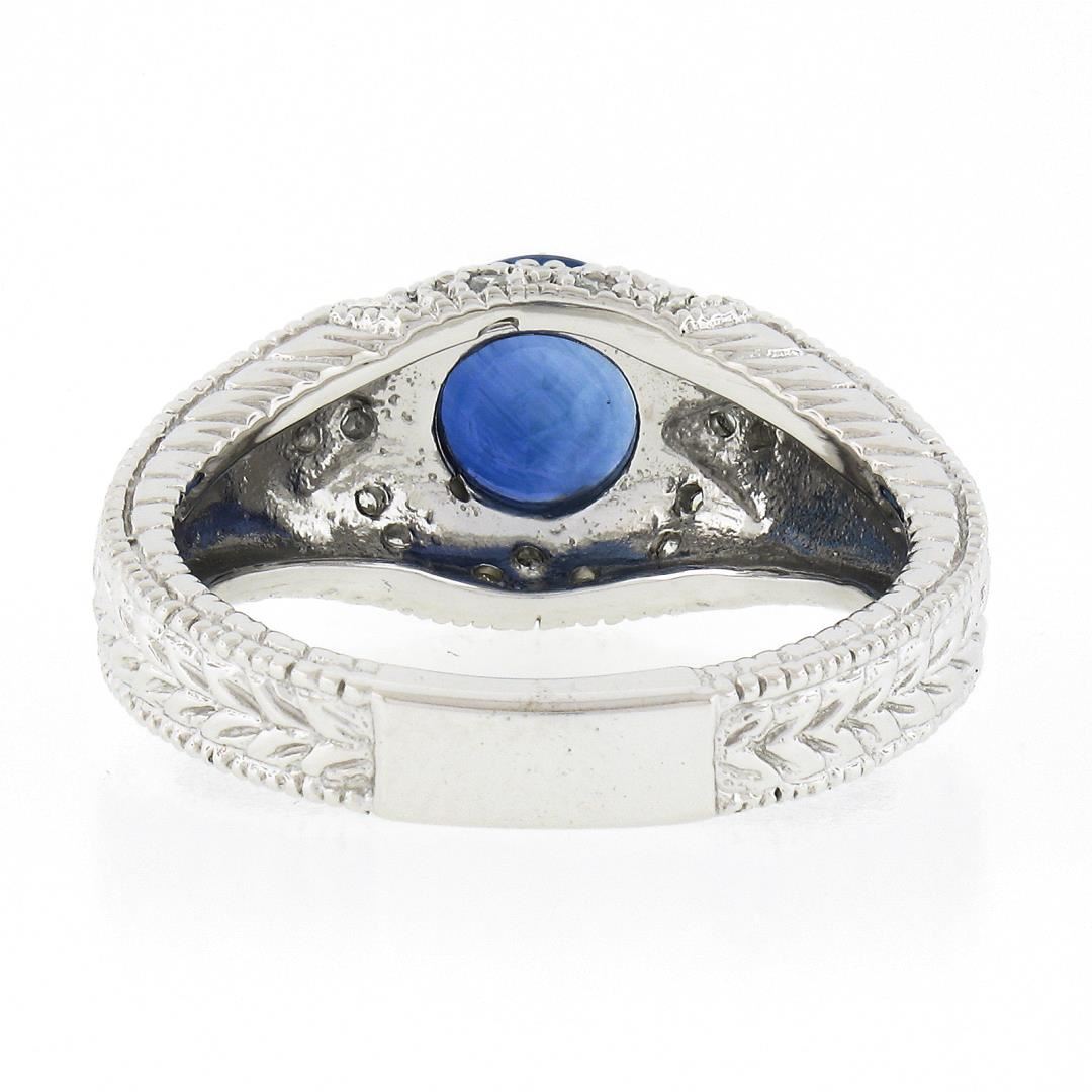 A new solid 14k white godl ring, with 1 GIA graded round natrual sapphire (1.65ct ), and 18 round brilliant cut natural diamonds (F/G  - VS2/SI1 ; 0.18ctw. The ring is size 6.5, weighs a total of 6.42 grams, and measures 9.4mm wide. Comes with all original relevant certifications.