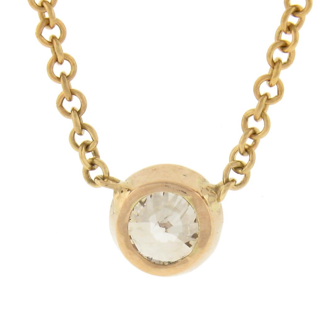 A new solid 14k rose gold solitaire pendant necklace, with 1 round cut natural champagne diamond (I1 ; 0.15ct), Adjustable 16 or 18 inch cable link chain, 1.74 grams total weight, pendant measures 4.3mm in diameter.