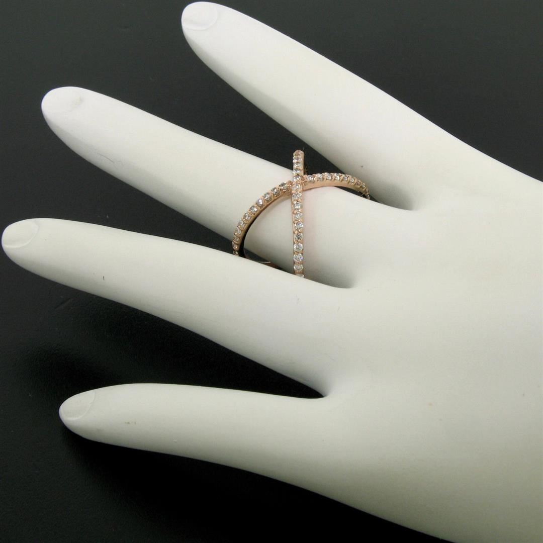 A new solid 14k rose gold X ring, with 45 round brilliant cut natural diamonds (G - VS2 ; 0.50ctw). The ring is size 5.75, weighs a total of 3.0 grams, and measures 13.60mm wide.