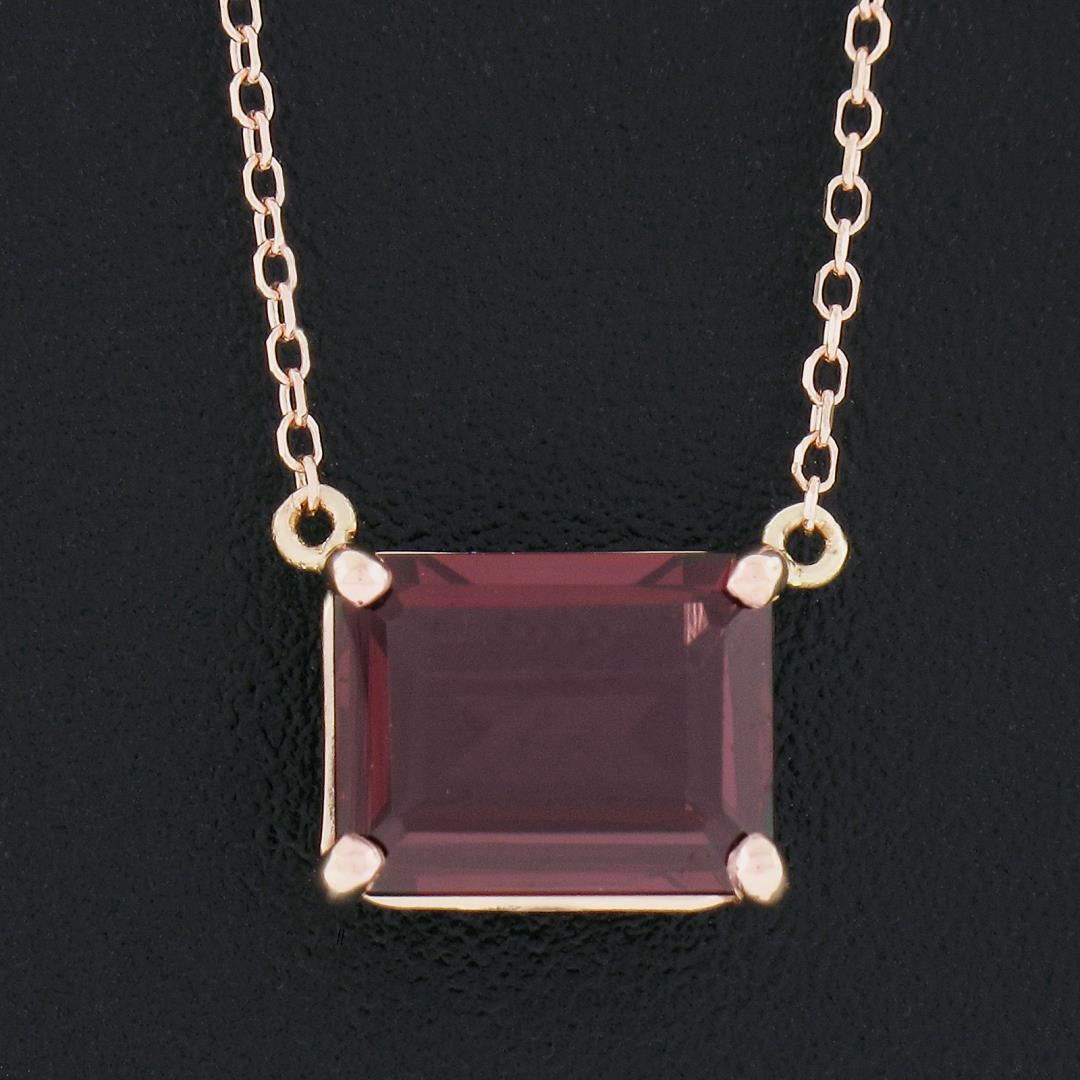 A new solid 14k rose gold pendant necklace, with 1 rectangular step cut natural garnet (1.97ct). Adjustable at 16.5 & 18.5 inch cable link chain, 1.84 grams total weight, pendant measures 7x9mm.