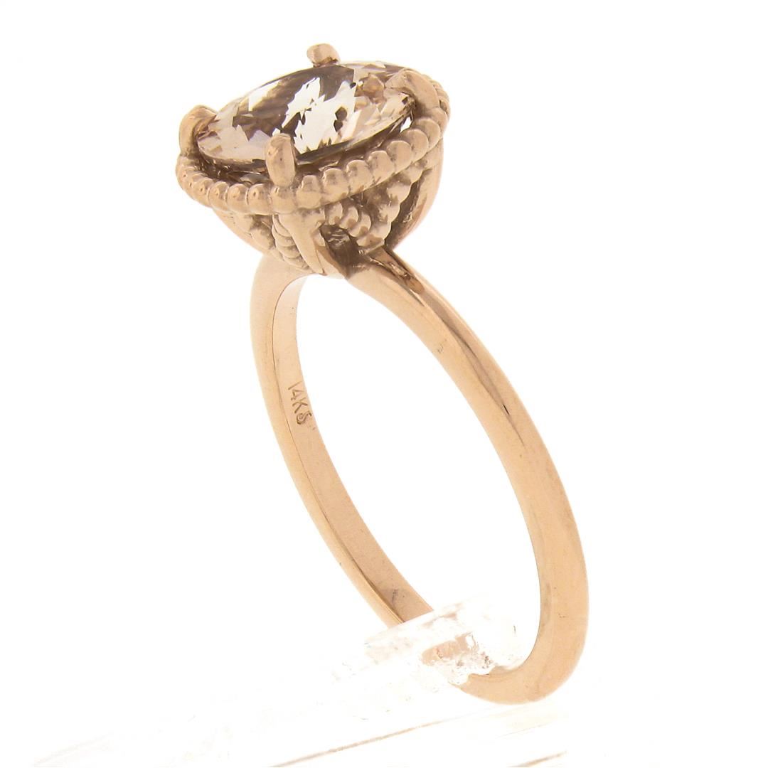 A new solid 14k rose gold soliatire ring, with 1 round cut natural morganite (1.98ctw). The ring is size 7.0, weighs a total of 3.72 grams, and measures 11mm wide.