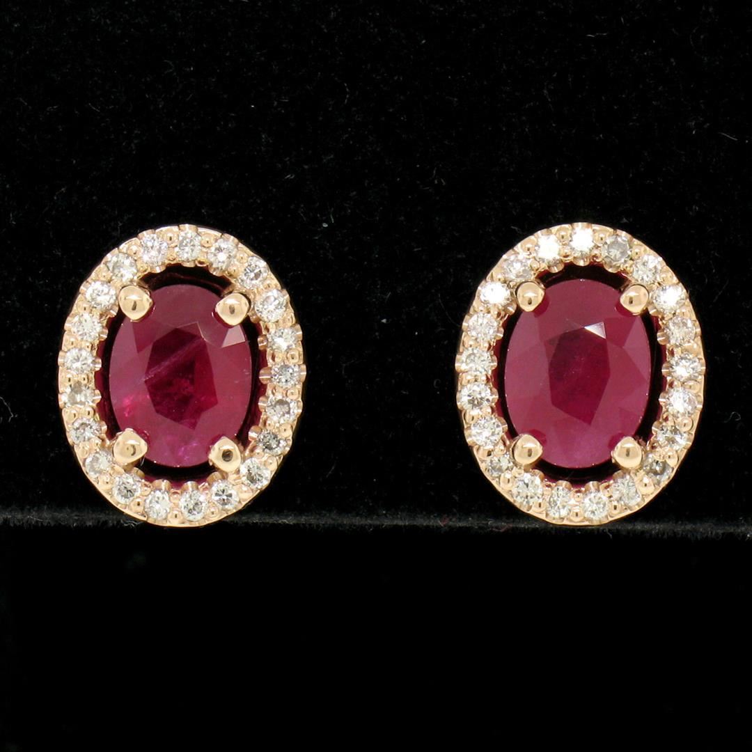A new solid 14k rose gold pair of stud earrings, featuring 2 oval cut natural rubies (2.19ctw), surrounded with a halo of 42 round brilliant cut natural diamonds (G- VS2; 0.35ctw). The earrings measure approximately 11.60x9.59mm and weigh a total of 3.5 grams.