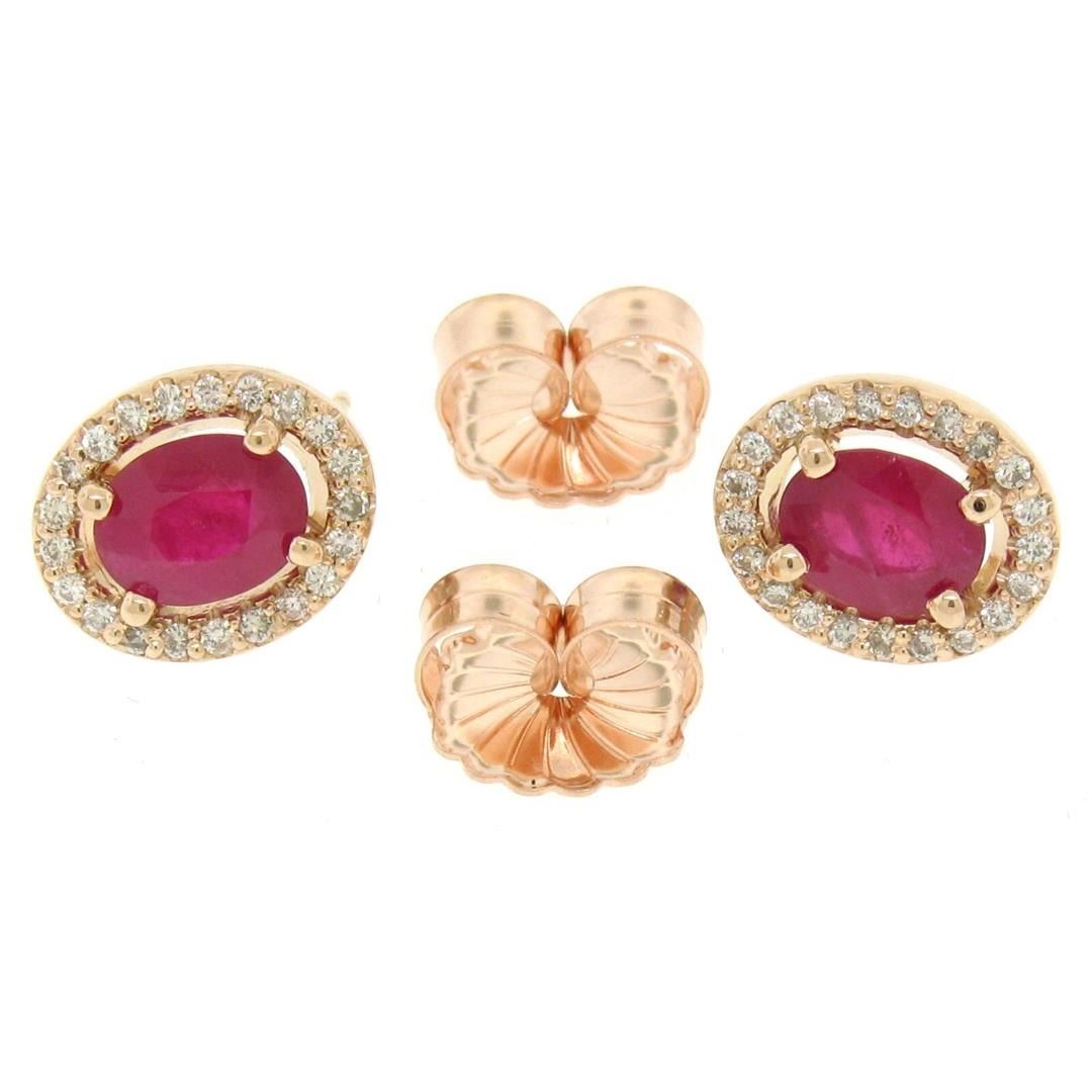 A new solid 14k rose gold pair of stud earrings, featuring 2 oval cut natural rubies (2.19ctw), surrounded with a halo of 42 round brilliant cut natural diamonds (G- VS2; 0.35ctw). The earrings measure approximately 11.60x9.59mm and weigh a total of 3.5 grams.