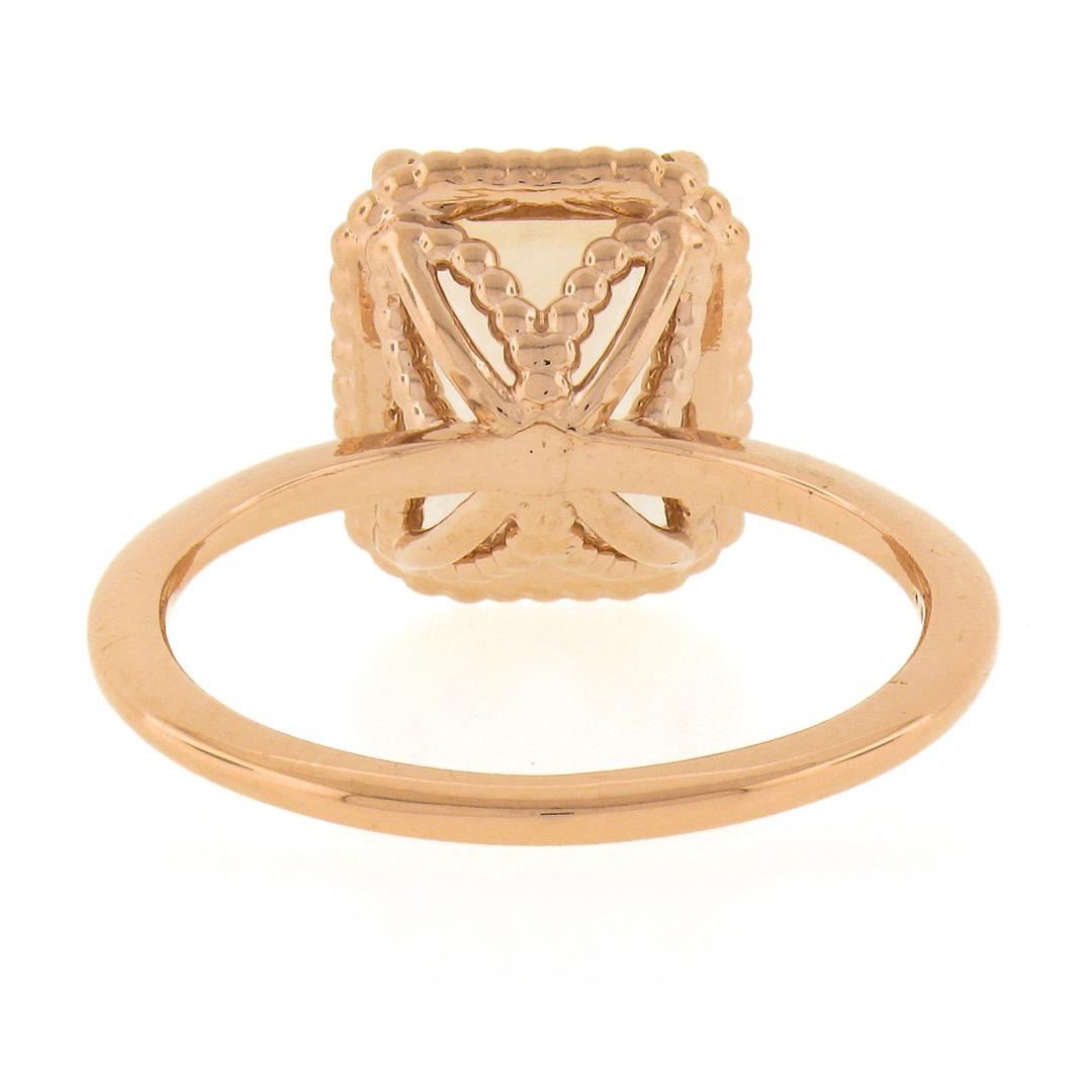 A new solid 14k rose gold solitaire ring, with 1 emerald cut natural morganite (3.13ct). The ring is size 7.0, weighs a total of 3.66 grams, and measures 12mm wide.
