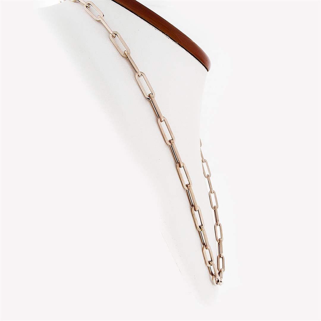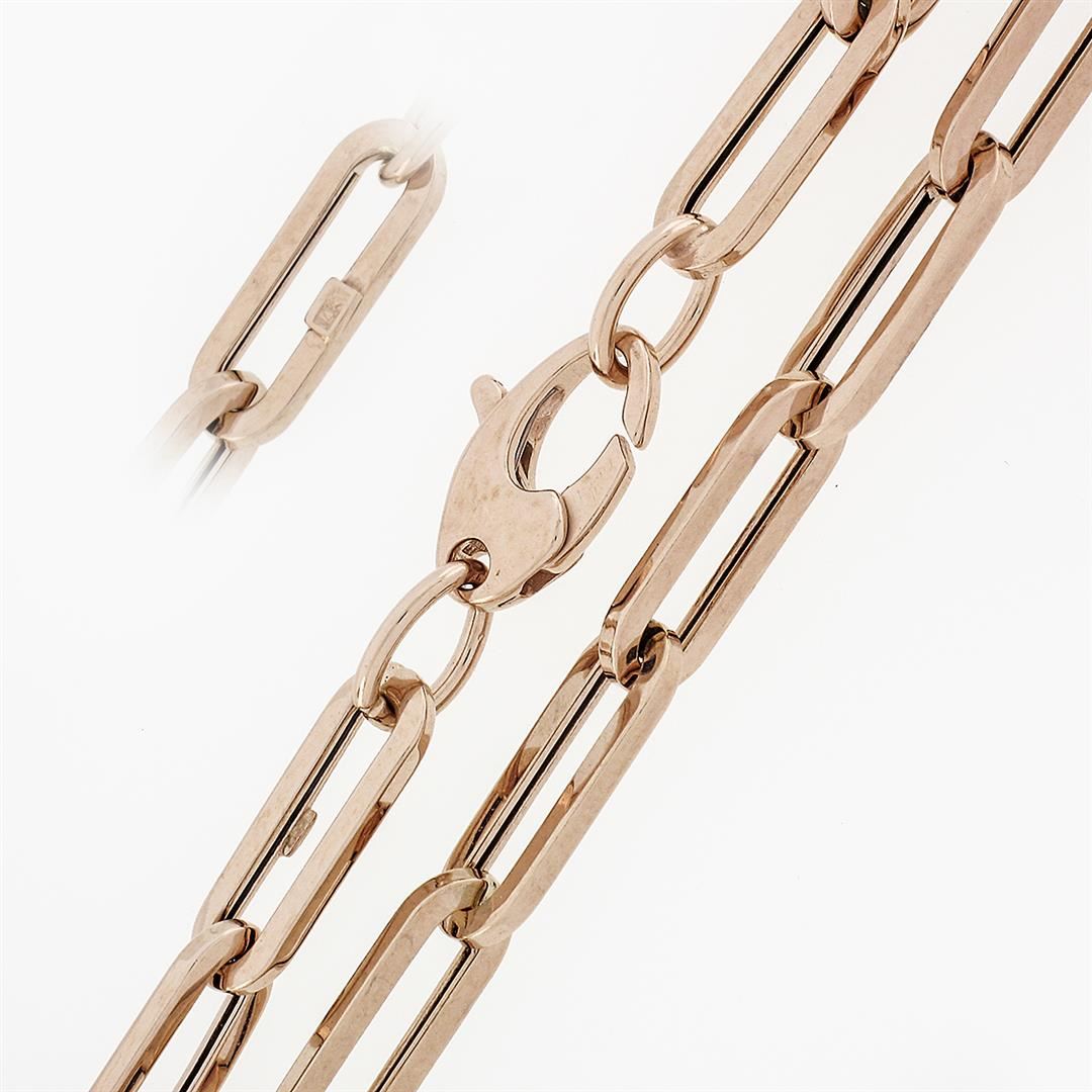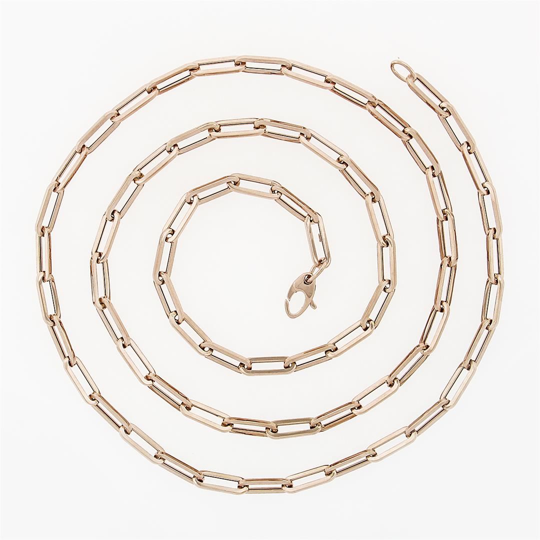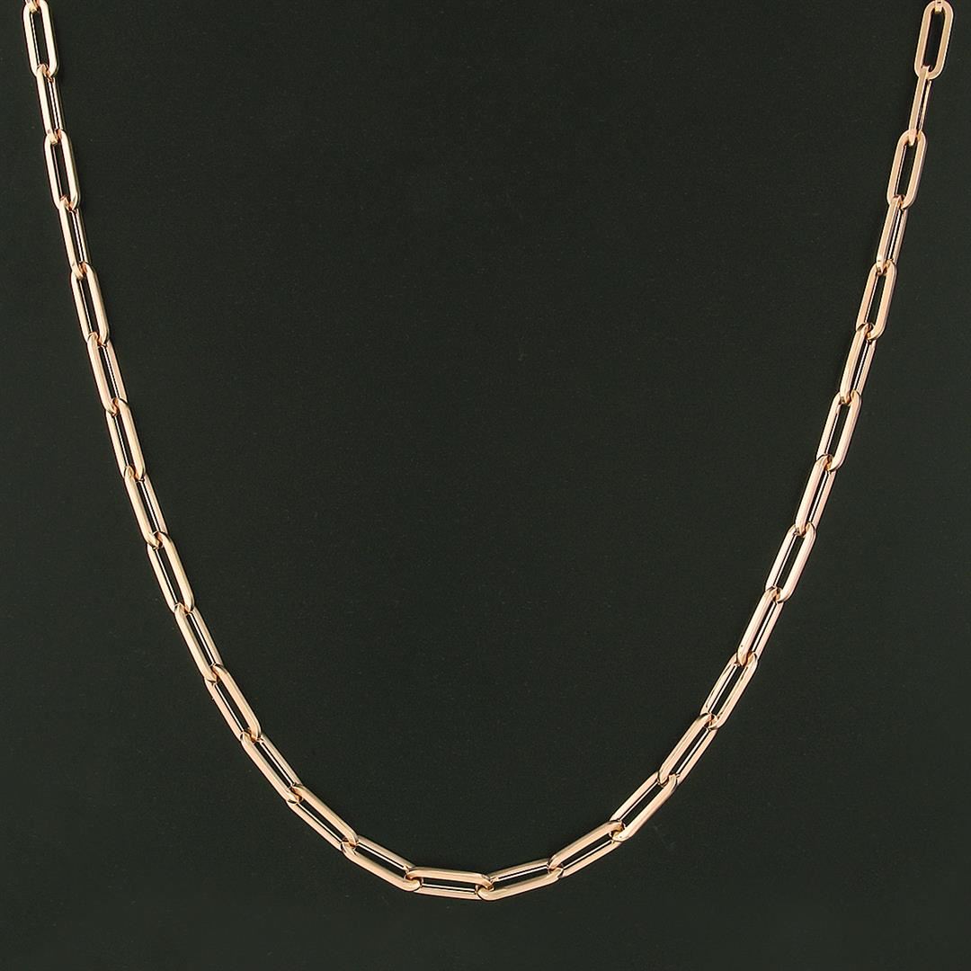 A new solid 14k rose gold oval paperclip chain necklace. It weighs a total of 13.33 grams, measures 4.5mm wide, and measures 30 inches in length.