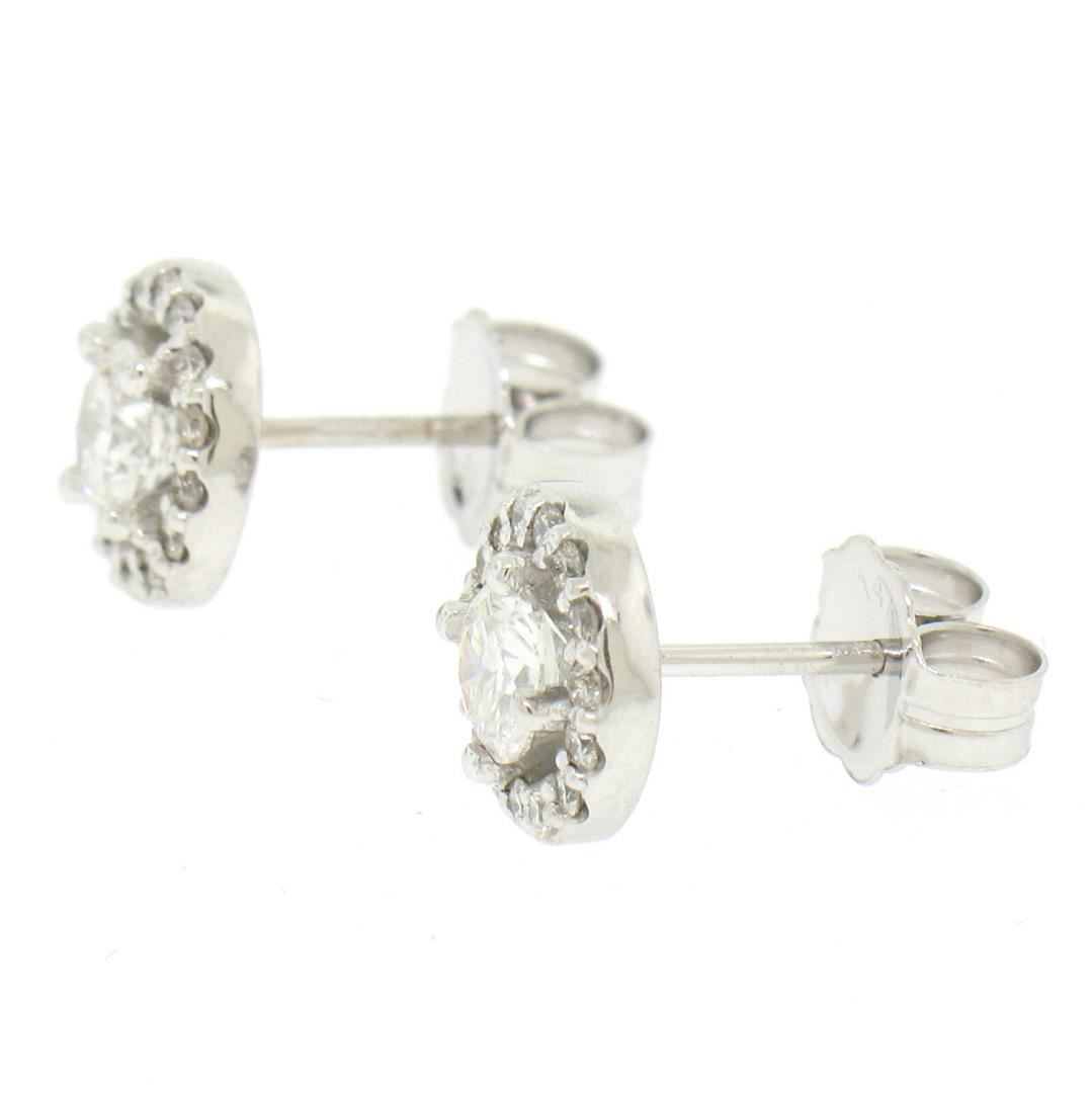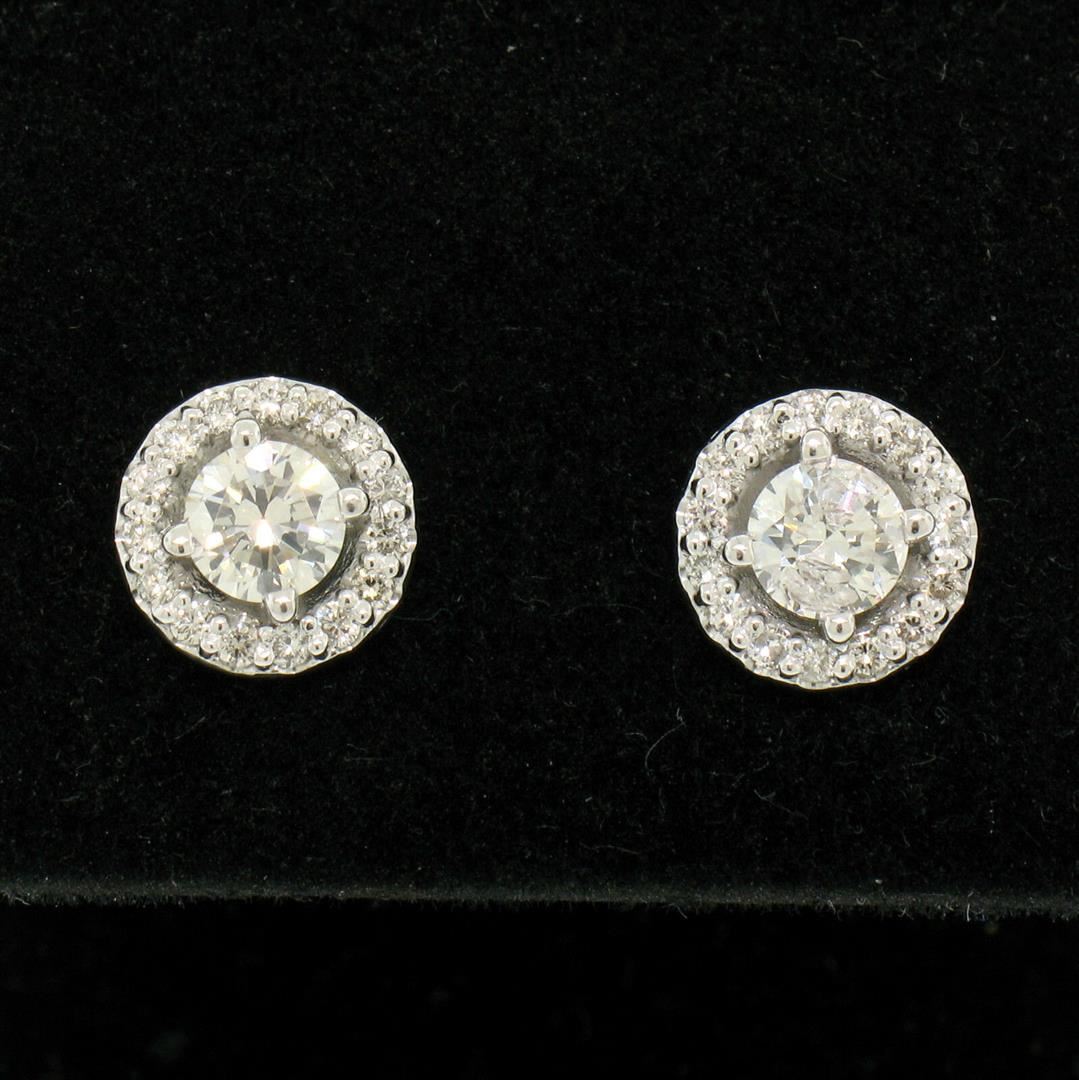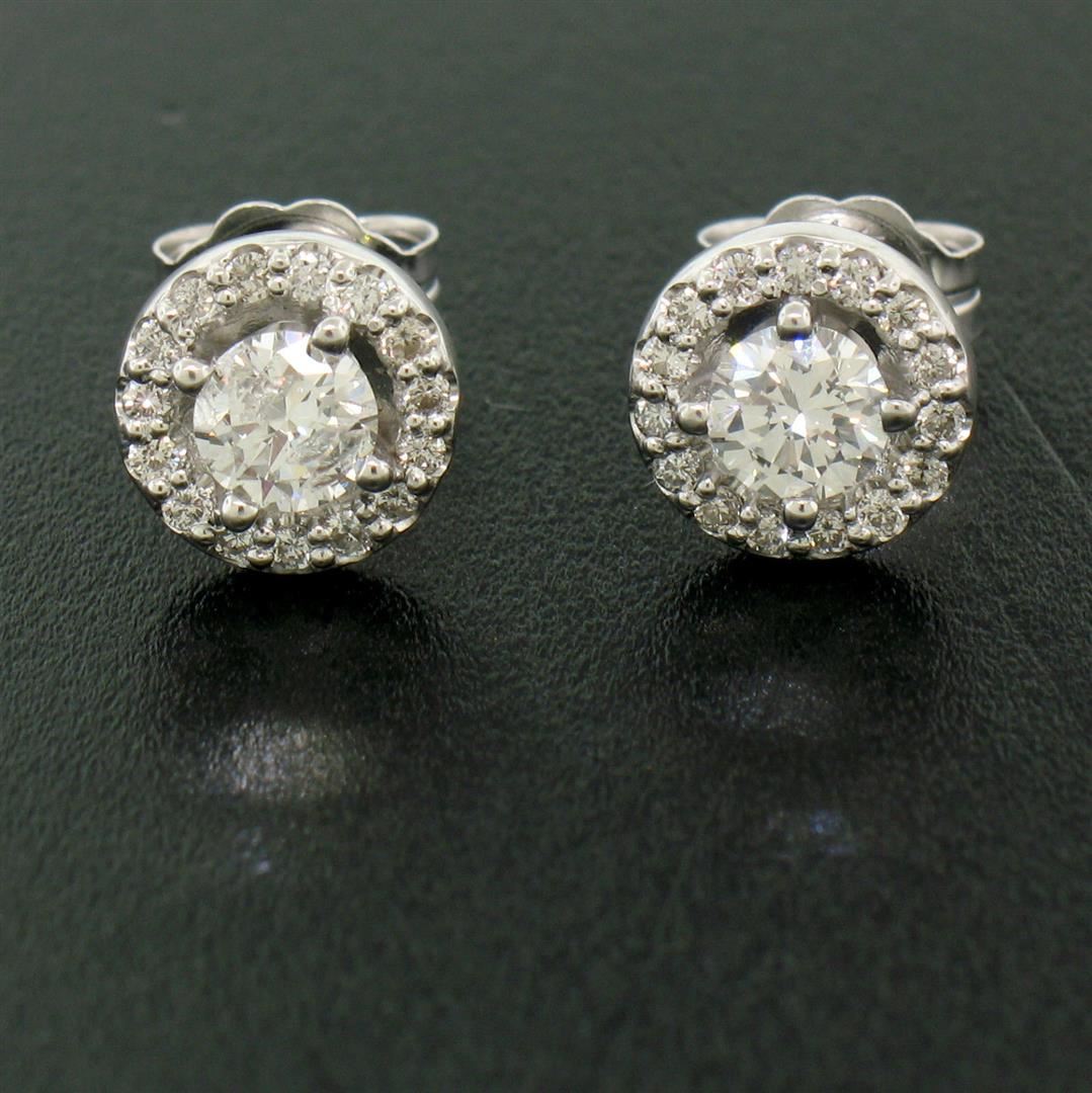 One Pair NEW 14k White Gold 1.06ctw Round Brilliant Diamond Stud Earrings w/ Pave Halos. Item Details: Material: 14k Solid White Gold, Weight: 2.1 Grams, Stone(s): (2) Natural Genuine Diamonds - Round Brilliant Cut - Prong Set - SI2/I1 Clarity - G Color - 0.76ctw (approx.), (30) Natural Genuine Diamonds - Round Brilliant Cut - Prong Set - VS2/SI1 Clarity - G/H Color - 0.30 ctw (approx.), Total Carat Weight: 1.06 (approx.), Backing: Post Back w/ Butterfly Closure, Diameter: 8.23mm, Thickness: 2.92mm projection off the ear Condition: New w/o Tag