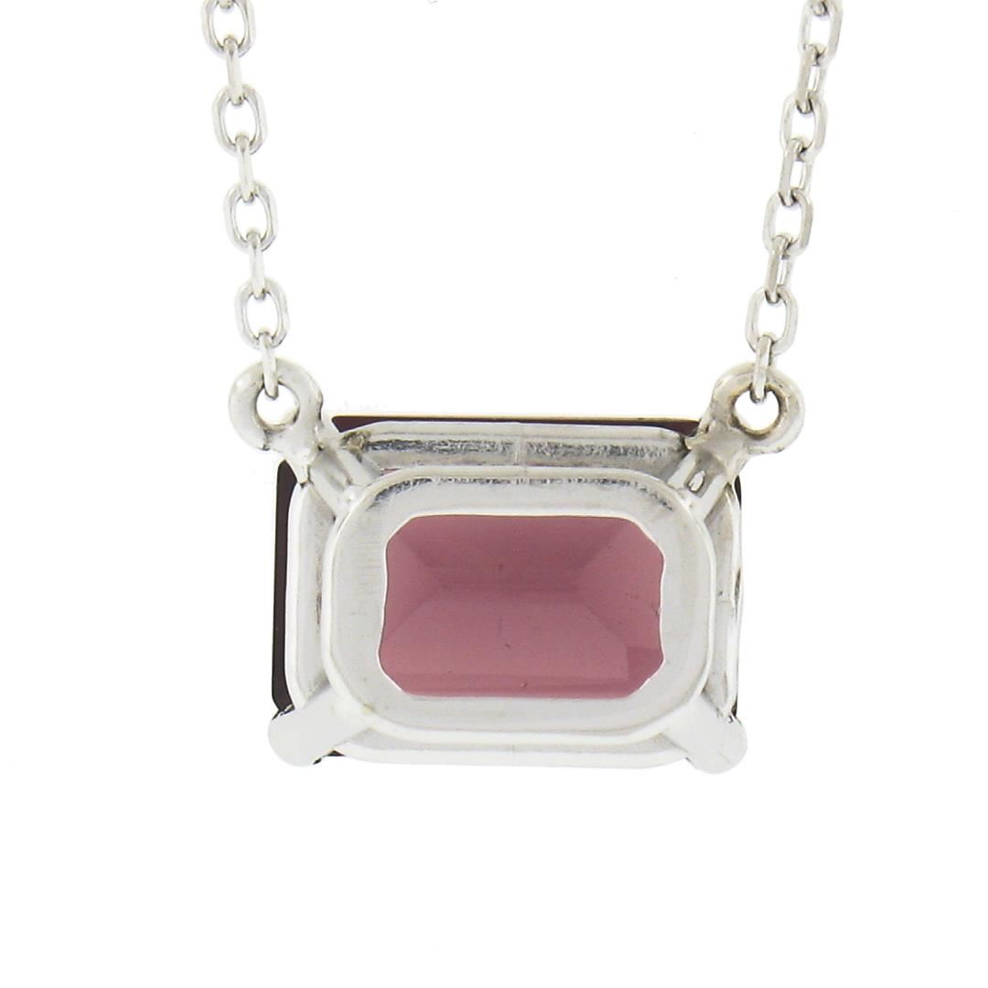 A new solid 14k white gold pendant necklace, with 1 rectangular step cut natural garnet (1.50ct). Adjustable at 16.5 & 18.5 inch cable link chain, 1.74 grams total weight, pendant measures 6.3x8.3mm.