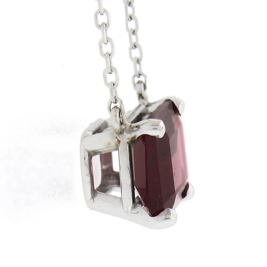 A new solid 14k white gold pendant necklace, with 1 rectangular step cut natural garnet (1.50ct). Adjustable at 16.5 & 18.5 inch cable link chain, 1.74 grams total weight, pendant measures 6.3x8.3mm.