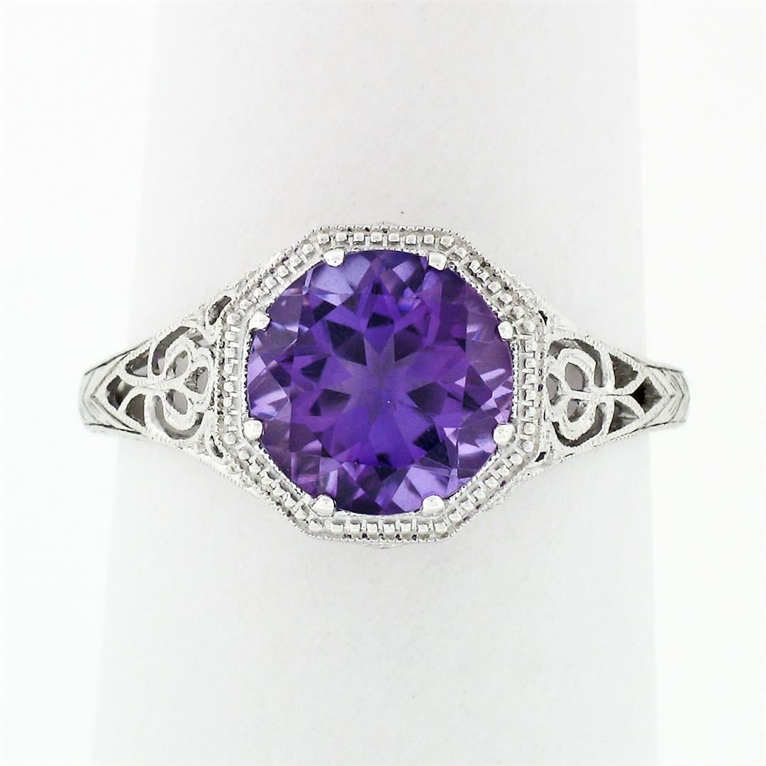 NEW 14k White Gold 1.85 ctw Fine Filigree & Milgrain Work Amethyst Solitaire Rin