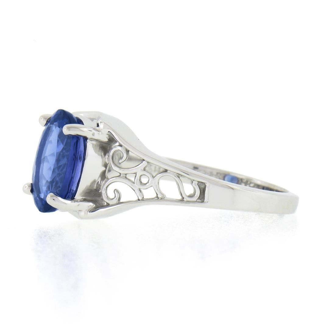 A new 14k white gold rong, with 1 oval cut natural tanzanite (1.91ct). The ring is size 6.5, weighs a total of 3.67 grams, and measures 9.6mm wide.