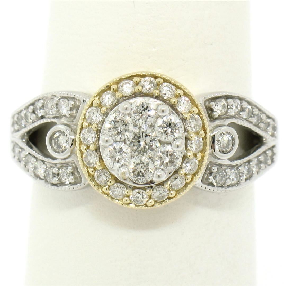 A new solid 14k yellow and white gold cluster ring, with 49 round brilliant cut natural diamonds (F/G- VS1; 0.75ctw). The ring is size 7.0, weighs a total of 4.60 grams, and measures 10.5mm wide.