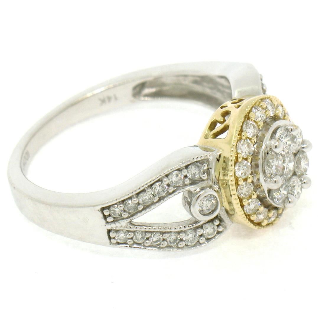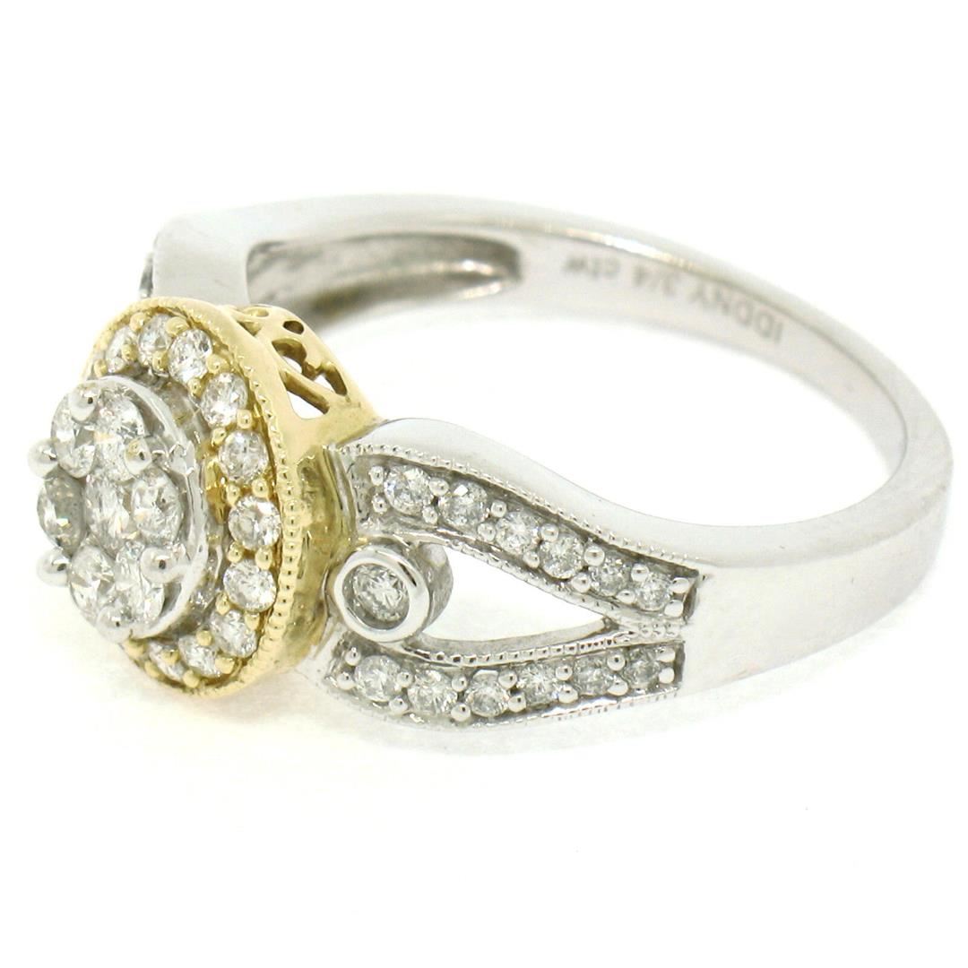 A new solid 14k yellow and white gold cluster ring, with 49 round brilliant cut natural diamonds (F/G- VS1; 0.75ctw). The ring is size 7.0, weighs a total of 4.60 grams, and measures 10.5mm wide.