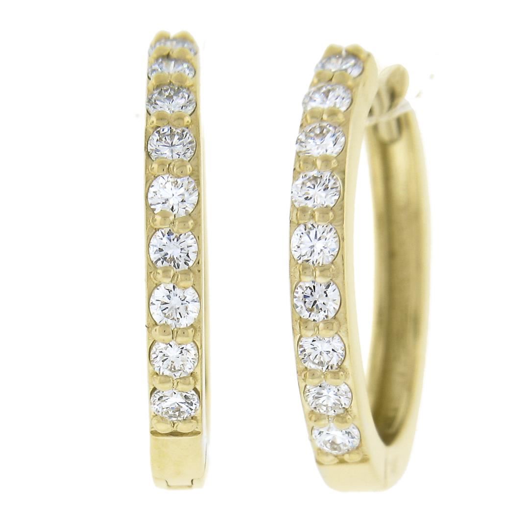 A new solid 14k yellow gold hoop earrings, with 18 round cut natural diamonds (F/G - VS1/VS2 ; 0.32ctw). The earrings measure approximately 15.4x2.1mm and weigh a total of 2.36 grams.