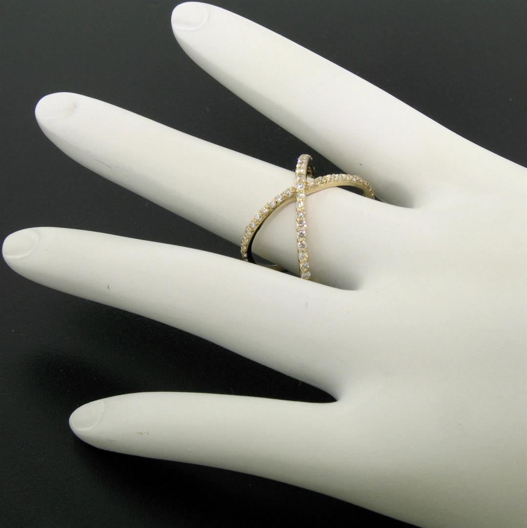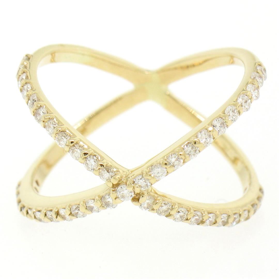 A new solid 14k yellow gold X ring, with 45 round brilliant cut naural diamonds (G - VS2 ; 0.50ctw). The ring is size 6.25, weighs a total of 2.9 grams, and measures 13.13mm wide.